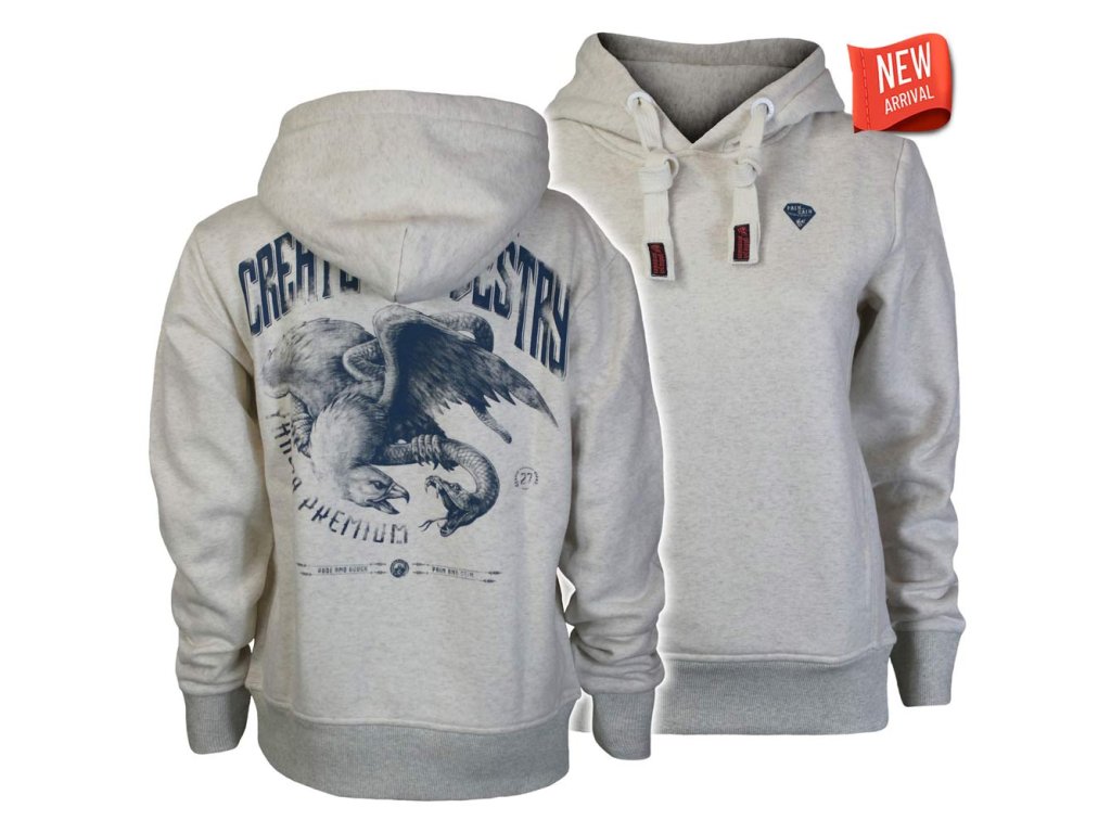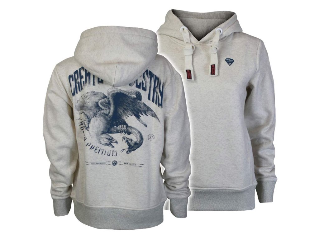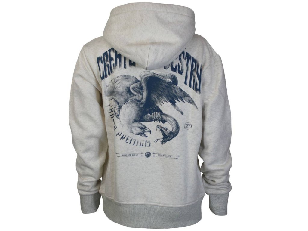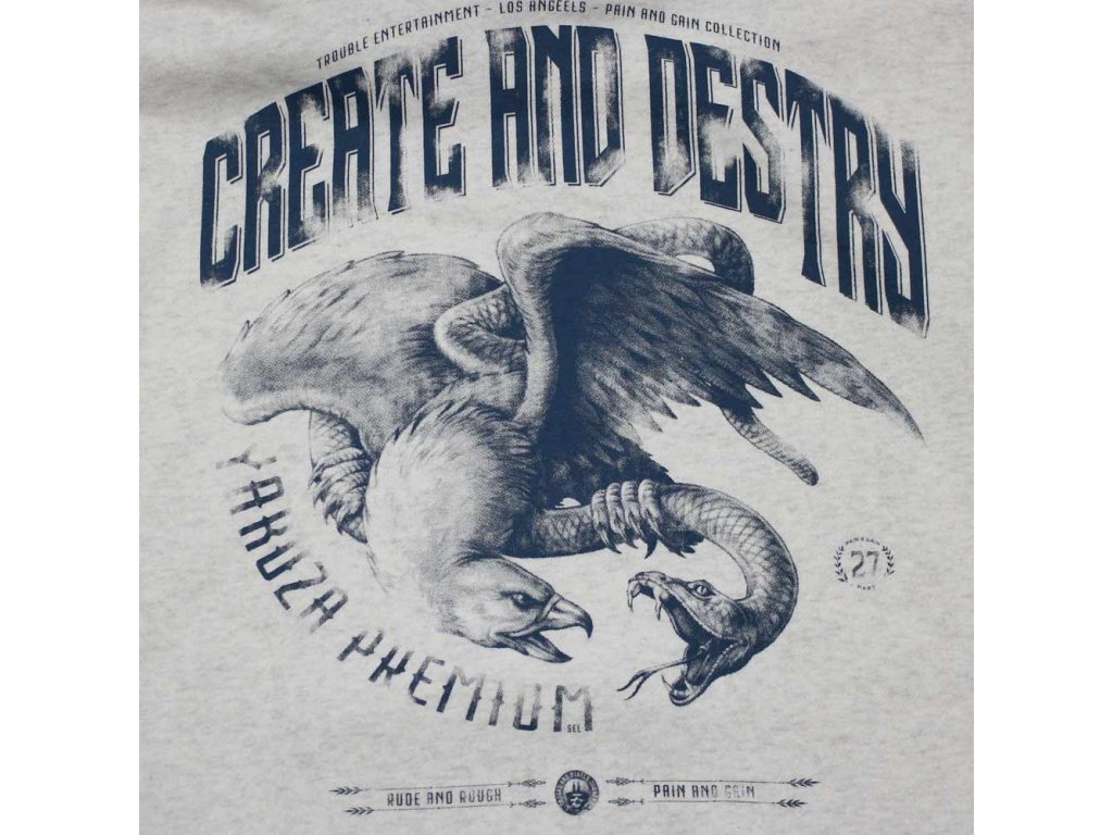Dámská mikina Yakuza Premium 3936 s kapucí ve světle šedém provedení je výrazný kousek inspirovaný streetwear a motorkářskou estetikou. Na zadní straně dominuje velký potisk s orlem a nápisem „Create and Destroy“. Přední strana je decentní, doplněná logem značky. Mikina má prostornou stahovací kapuci s plochými šňůrkami, praktickou klokaní kapsu a žebrované manžety i spodní lem pro perfektní držení tvaru.