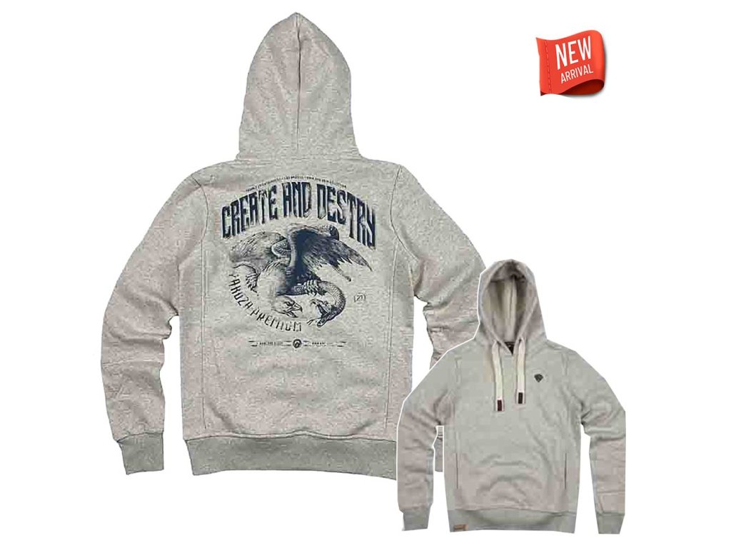 Dámská mikina Yakuza Premium 3936 s kapucí ve světle šedém provedení je výrazný kousek inspirovaný streetwear a motorkářskou estetikou. Na zadní straně dominuje velký potisk s orlem a nápisem „Create and Destroy“. Přední strana je decentní, doplněná logem značky. Mikina má prostornou stahovací kapuci s plochými šňůrkami, praktickou klokaní kapsu a žebrované manžety i spodní lem pro perfektní držení tvaru.