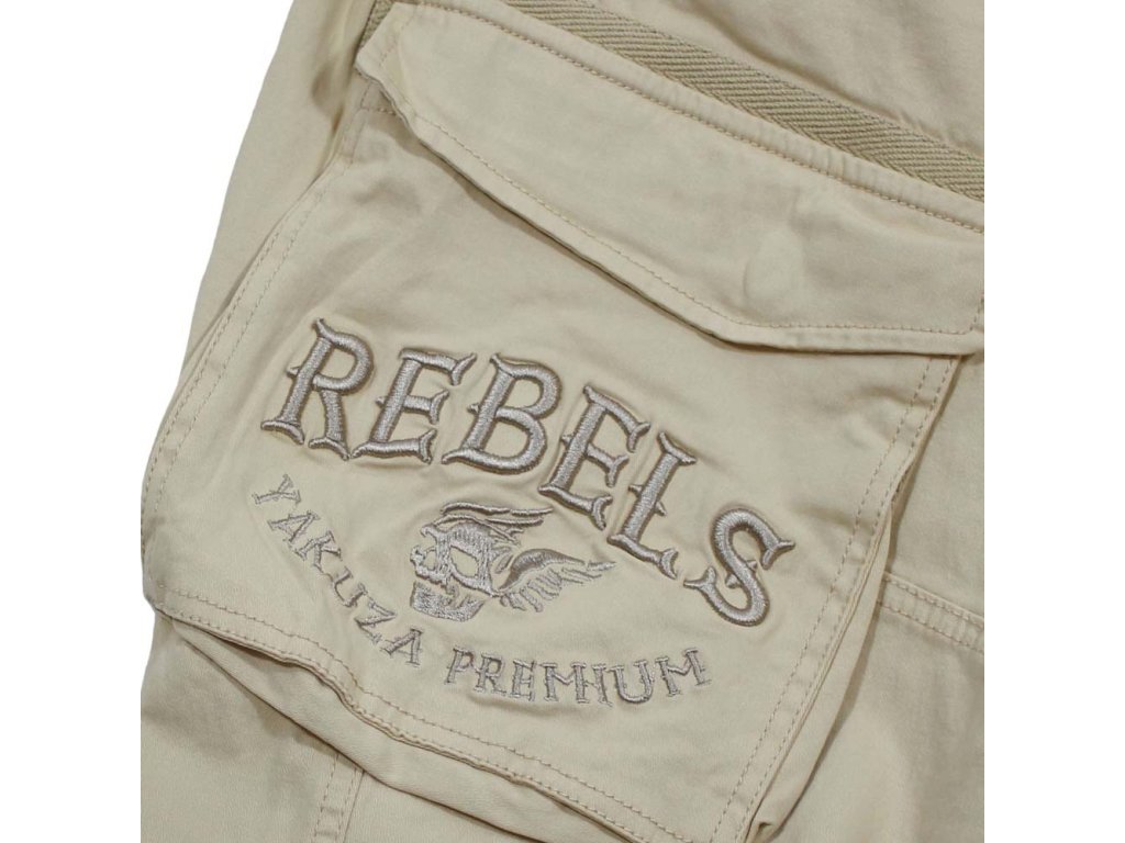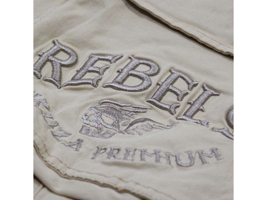 Na přední straně najdeš dvě klasické kapsy. Boční strany zdobí dvě cargo kapsy s klopami a výšivku „REBELS“