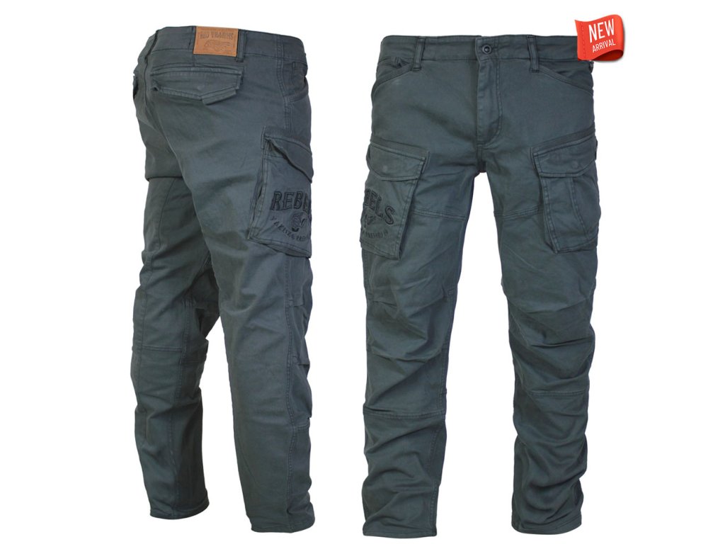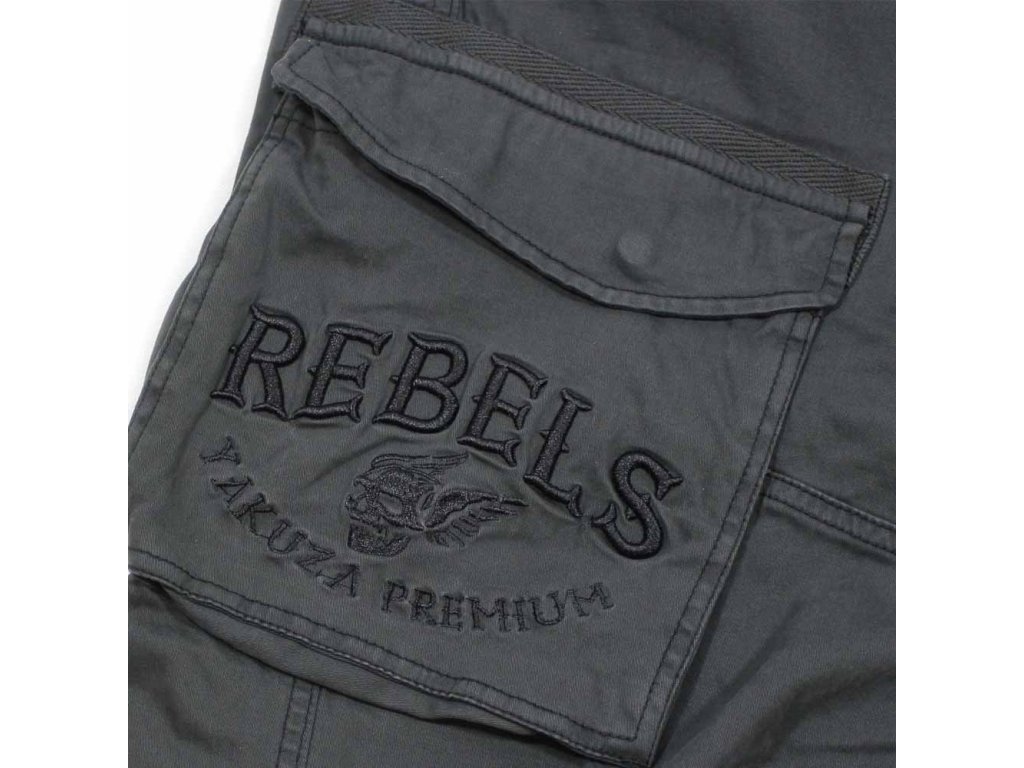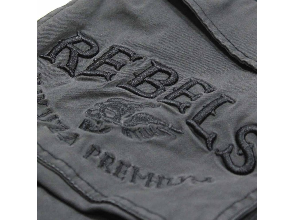 Na přední straně najdeš dvě klasické kapsy. Boční strany zdobí dvě cargo kapsy s klopami a výšivku „REBELS“
