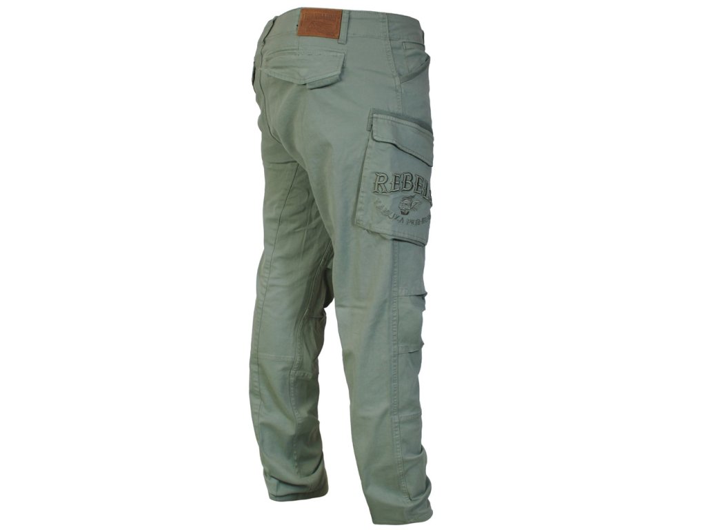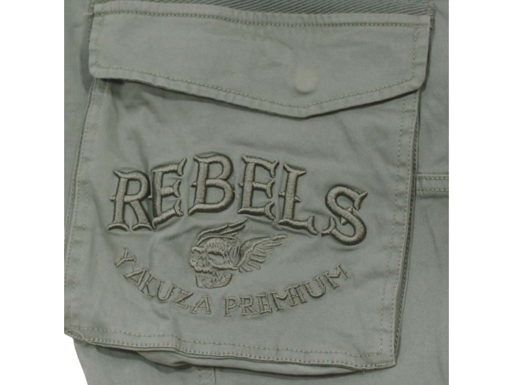 Na přední straně najdeš dvě klasické kapsy. Boční strany zdobí dvě cargo kapsy s klopami a výšivku „REBELS“