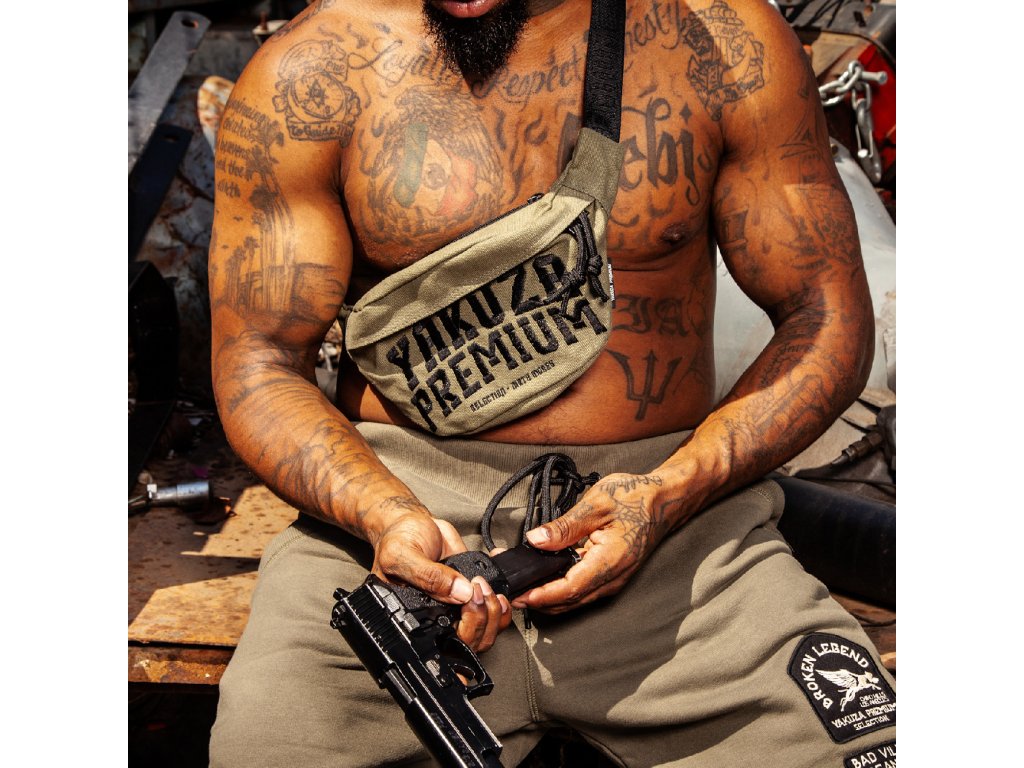 Ledvinka (taška) na opasek 3572 v zelené olivové barvě od Yakuza Premium Selection. Ledvinka je kvalitně zpracovaná a módní styl s vyobrazením z tetovacích salonů Vás nadchne. Na přední straně je propracovaná výšivka s nápisem YAKUZA PREMIUM SEL. Taška (ledvinka) je přibližně 30 cm široká a 12 cm vysoká. Ledvinka (taška) nabízí dvě rozměrné kapsy. Do hlavní kapsy dáte ty největší předměty – skvěle se hodí například pro uložení svítilny, nože či multitoolu. Již o něco menší prostor pak nabízí přední kapsa, do které se vejdou například cigarety. Ledvinka (taška) je vyrobena ze 100% recyklovaného polyesteru, který se získává ze starých PET lahví. Takové vybavení je nutností pro každého fanouška tetování a značky Yakuza Premium.