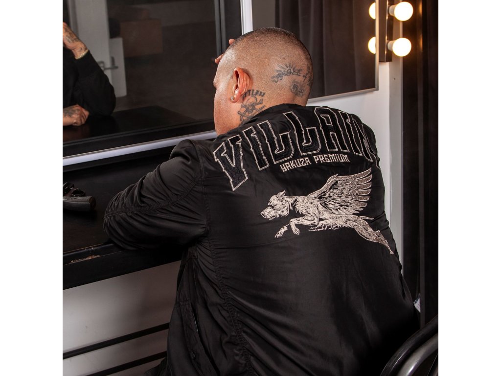 - Záda bundy: Velká propracovaná výšivka s textem "VILLAIN YAKUZA PREMIUM" a okřídleným bojovým psem.