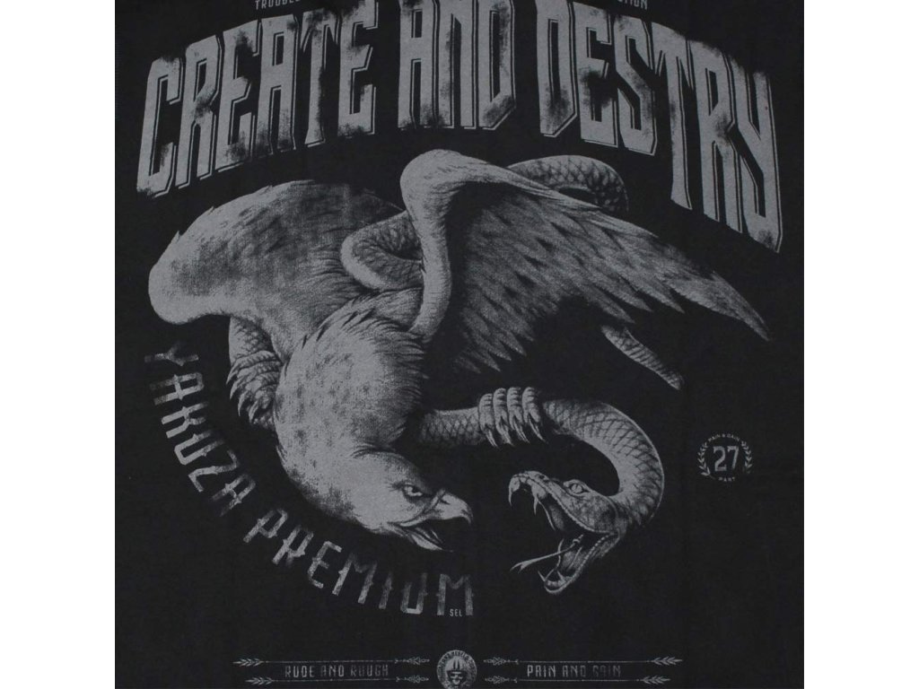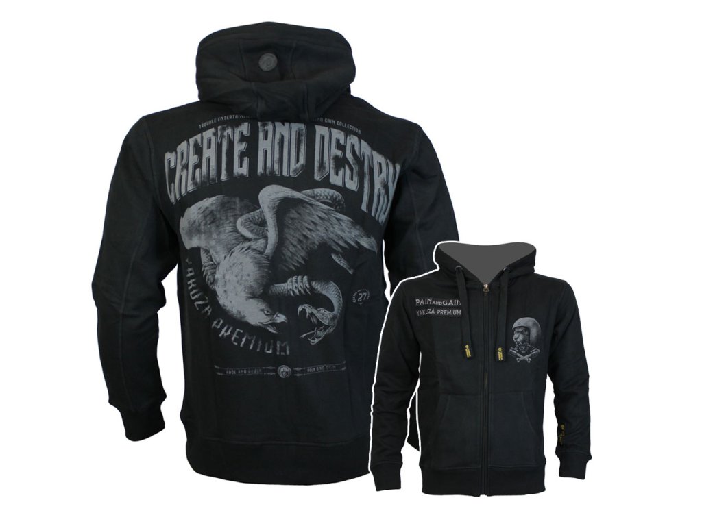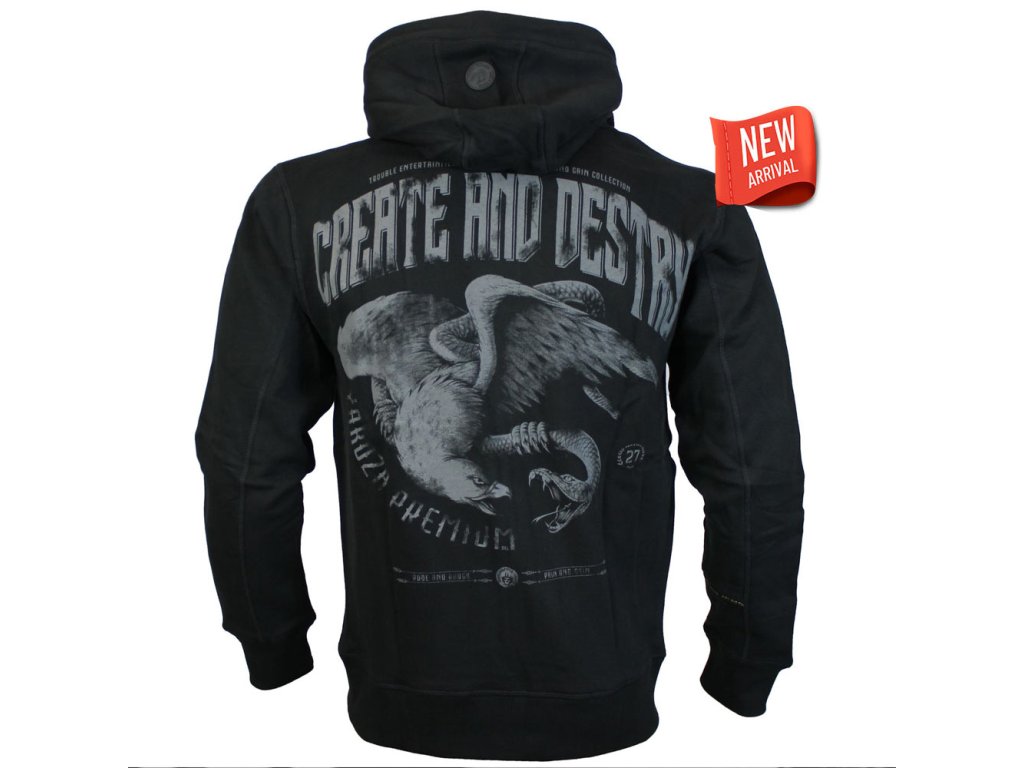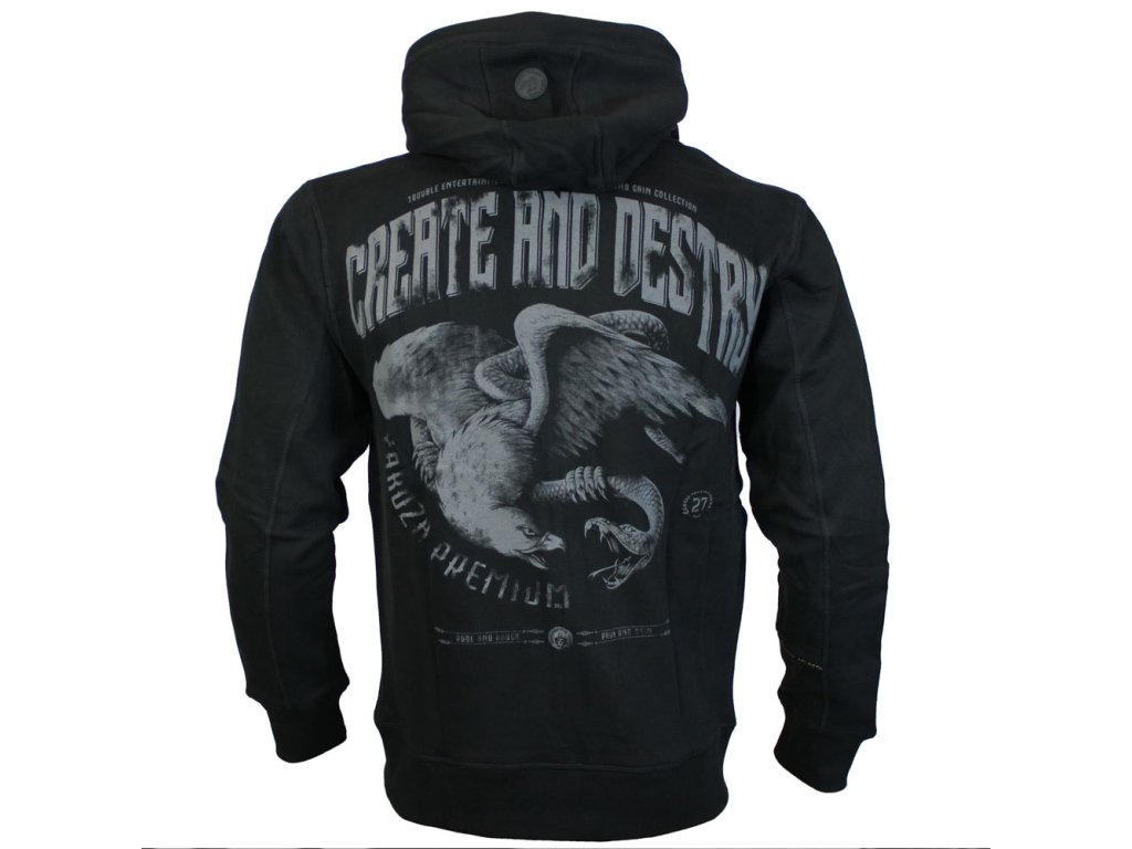 Černá pánská mikina Yakuza Premium Selection 3925A Create and destroy s výrazným motivem orla. Stylový design s kapucí, zipem a nápisy pro originální vzhled.