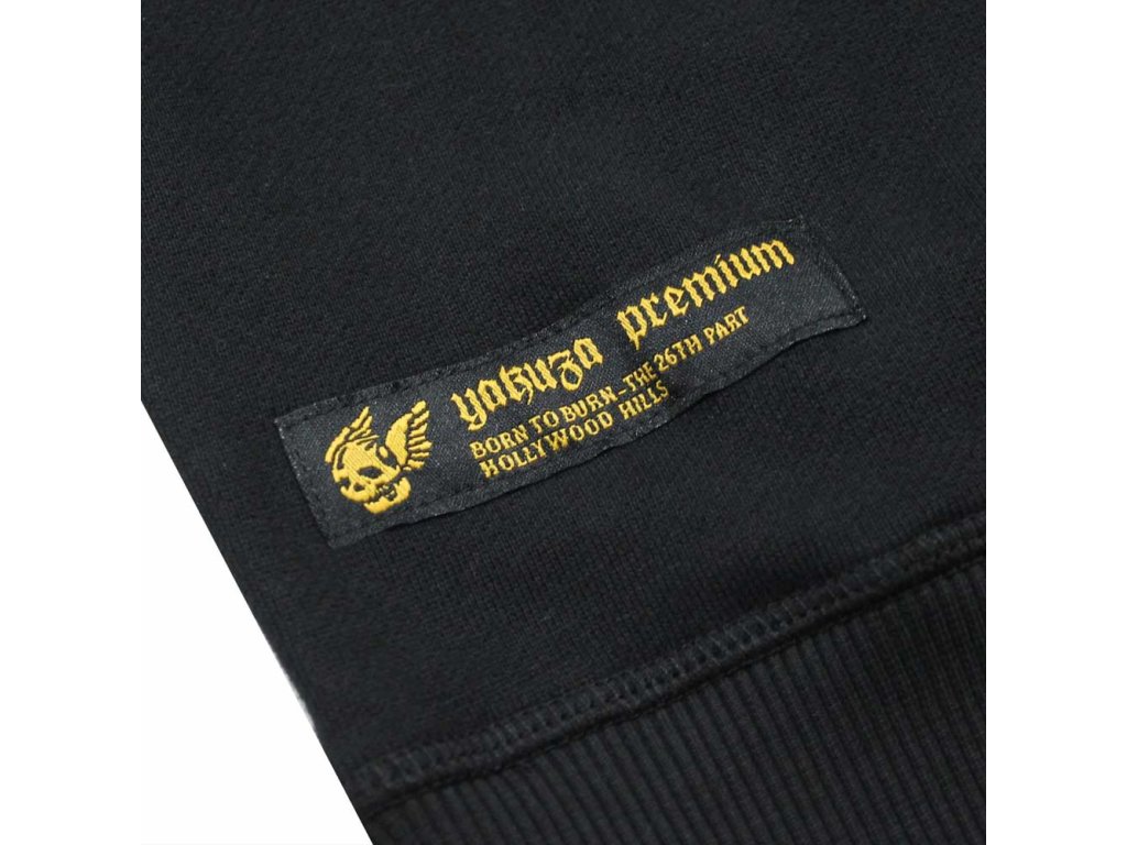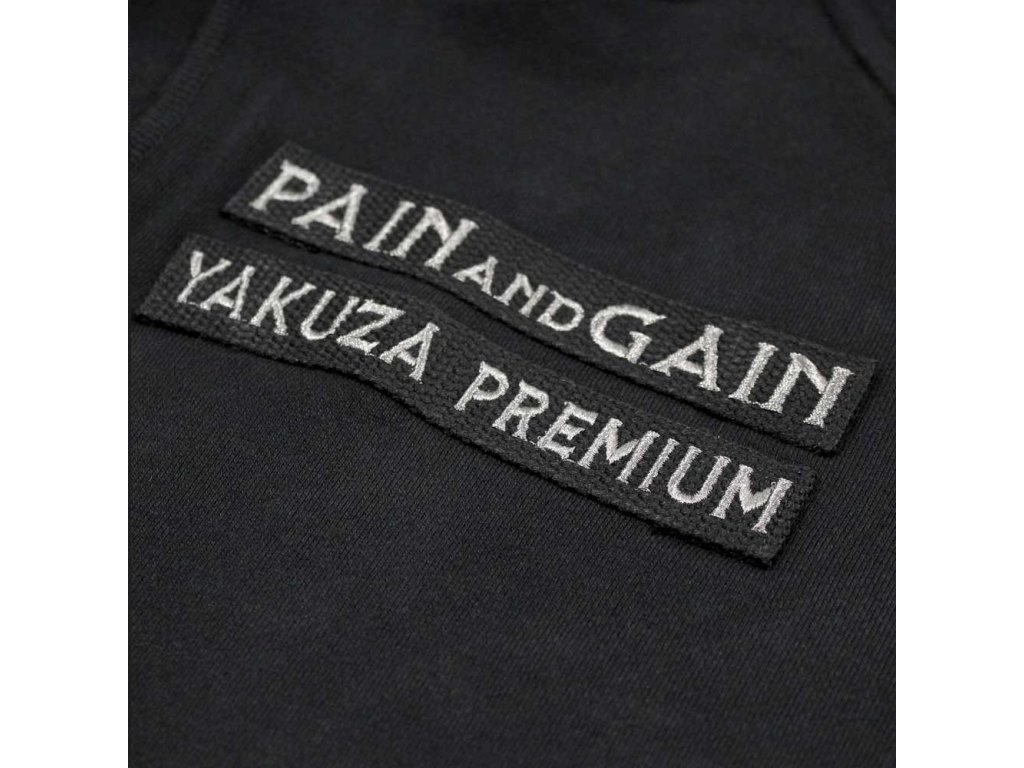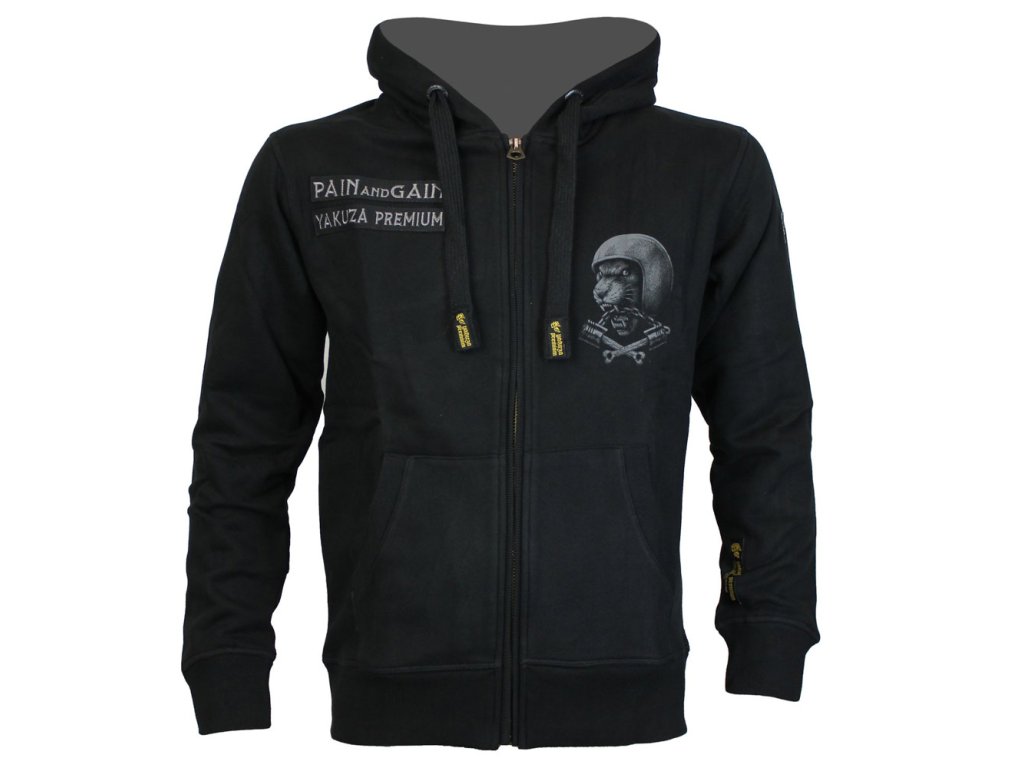 Na přední straně se nachází potisk s textem „PAIN and GAIN Yakuza Premium“ a grafikou lva v retro motocyklové helmě, který vyjadřuje odvahu a bojového ducha. Levý rukáv zdobí potisk lebky, pravý rukáv má decentní logo Yakuza Premium. Mikina má zapínání na zip, kapuci se stahovacími šňůrkami a dvě přední kapsy.