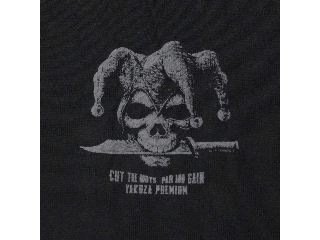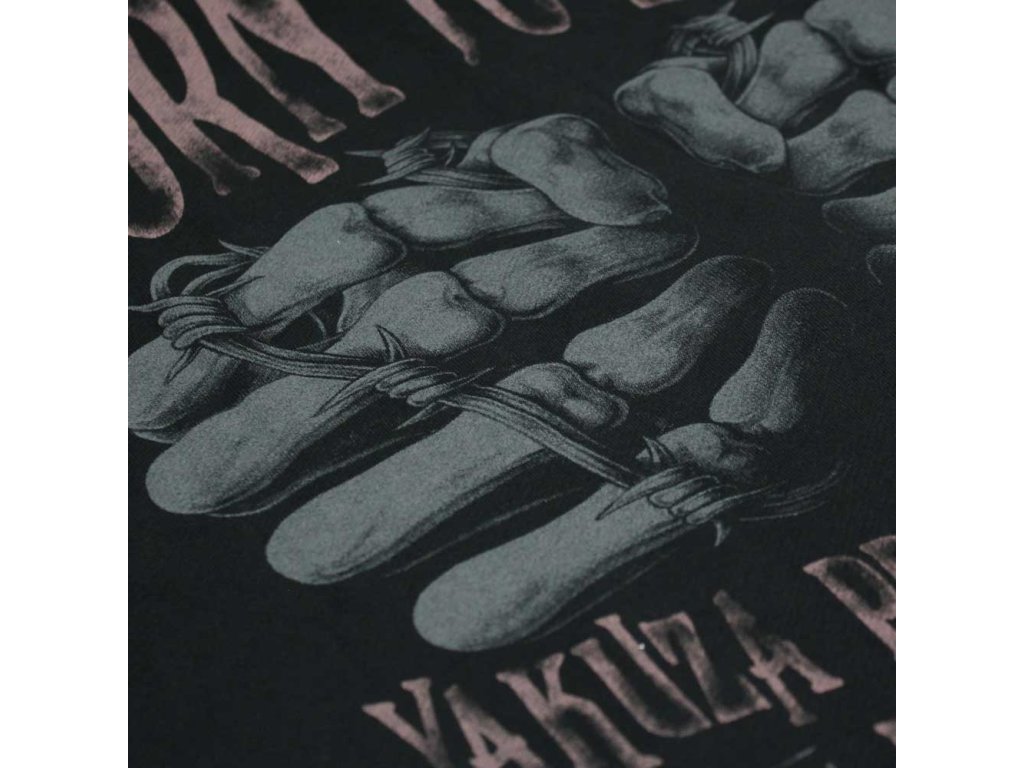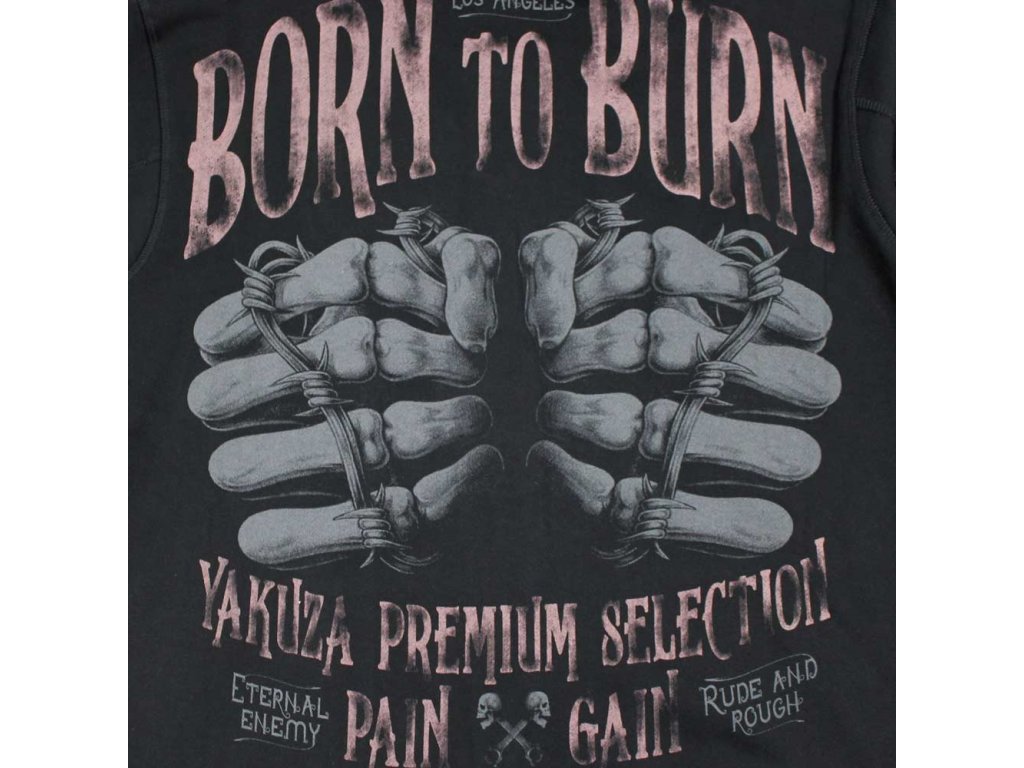 Přední strana má decentnější potisky – menší logo s motivem na hrudi a nápisy „Born to Burn“ a „Yakuza Premium“. Na rukávu je navíc potisk s okřídlenou lebkou, který podtrhuje autentický streetwear styl značky.