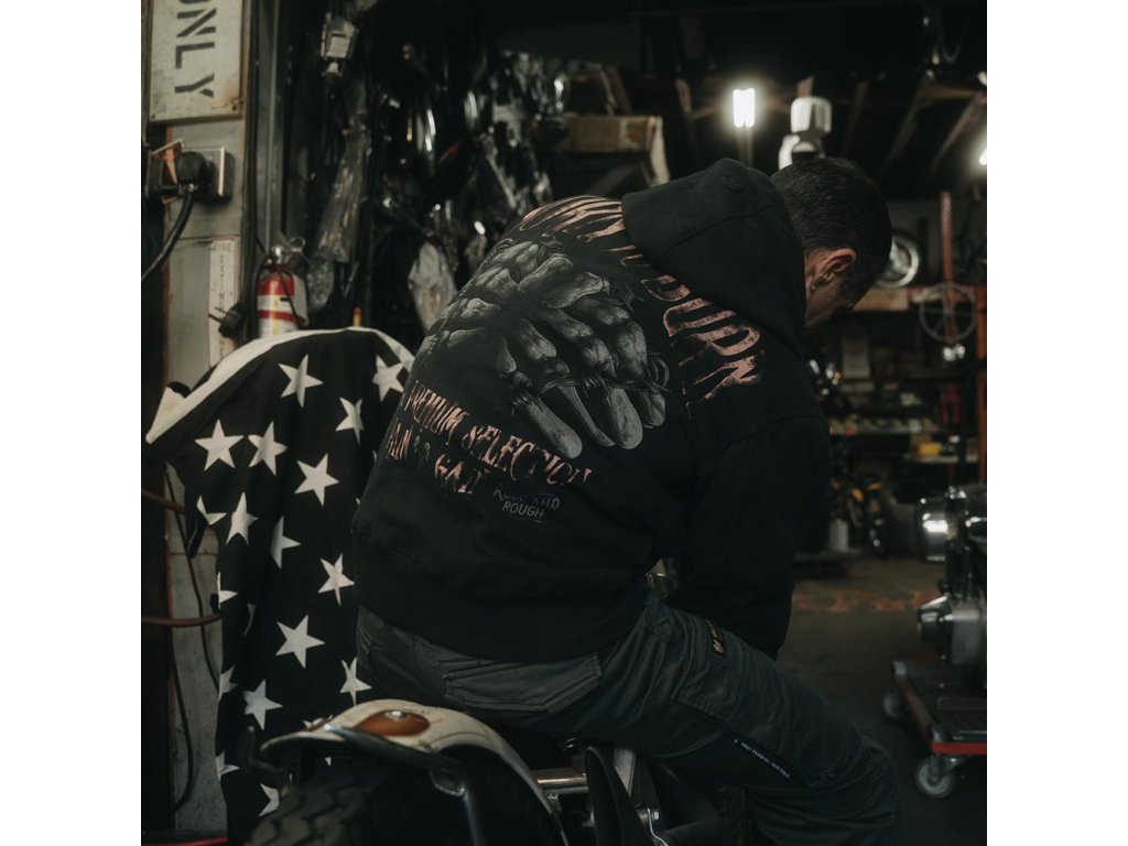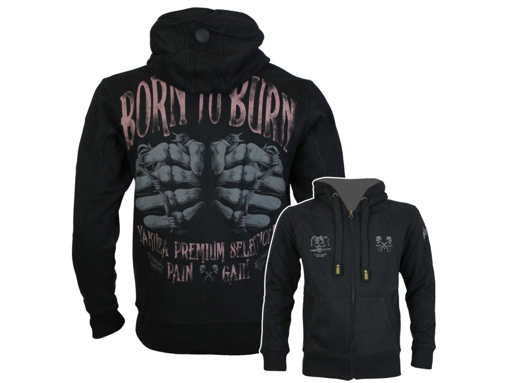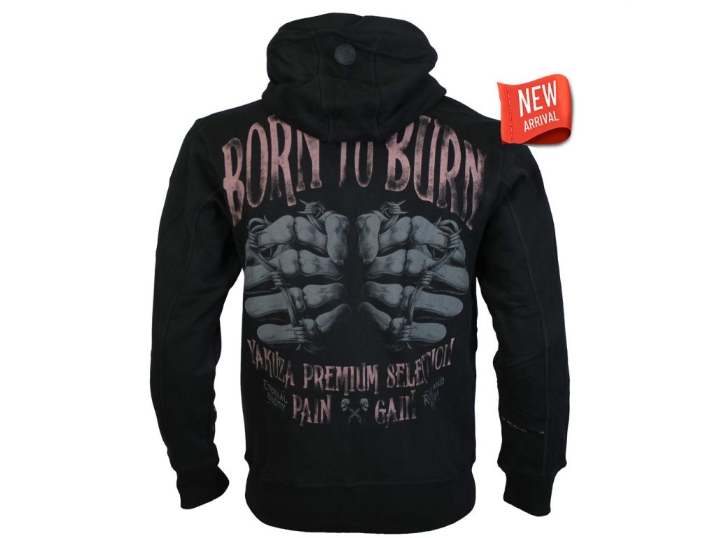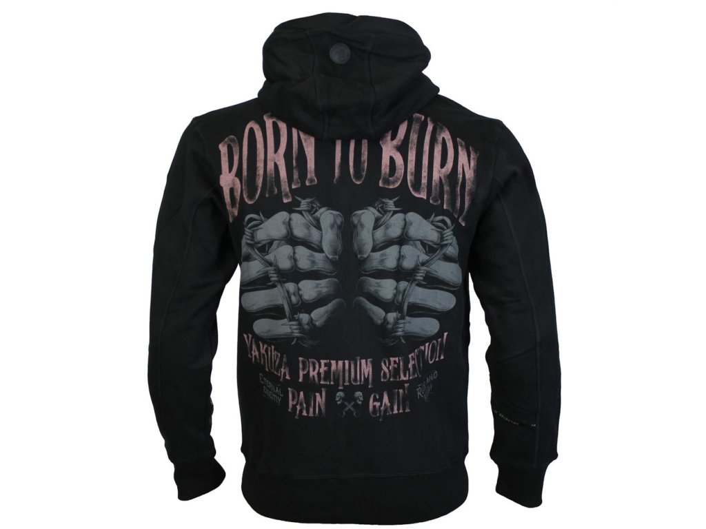 Mikina s kapucí z kolekce Yakuza Premium podzim/zima 2025 s výrazným motivem, který dokonale vystihuje rebelský charakter značky. Zadní část mikiny zdobí velký potisk dvou kostlivých rukou v ostnatém drátu, nad nimiž je nápis „Born to Burn“ a pod nimi texty „Yakuza Premium Selection“ a „Pain and Gain“. Tento motiv symbolizuje odpor vůči omezením, sílu a odhodlání žít naplno.