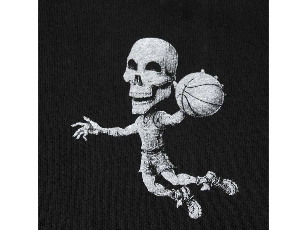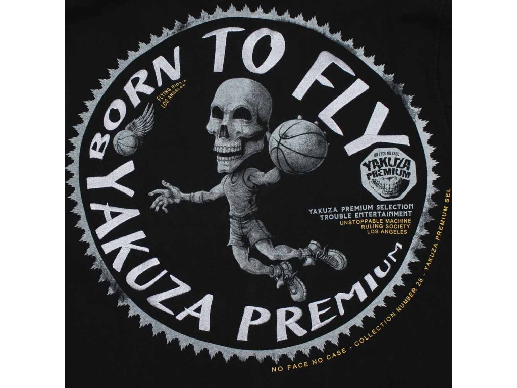 Přední strana je zdobená menším motivem postavičky-„kostlivce“ s basketbalovým míčem. Na levém rukávu nechybí další stylový potisk. Celý vizuál však dominuje na zádech — obrovský kruhový motiv BORN TO FLY s výrazným nápisem Yakuza Premium a ilustrací vysoko skákajícího skeletona. Motiv kombinuje prvky street artu, temného humoru a sportovní estetiky.