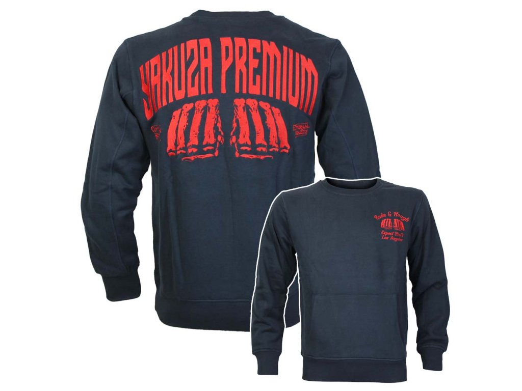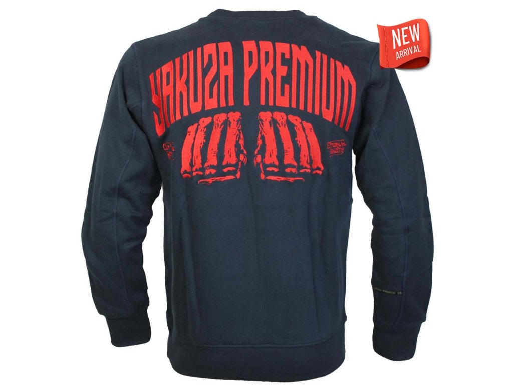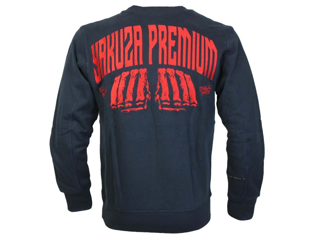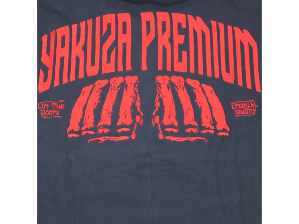 Tmavě modrá mikina Yakuza Premium 3920 s potisky sevřených kostnatých pěstí a výrazným nápisem „Yakuza premium“ na zádech. Styl pro odvážné – Rude and Rough