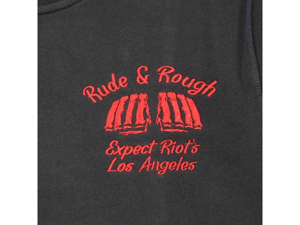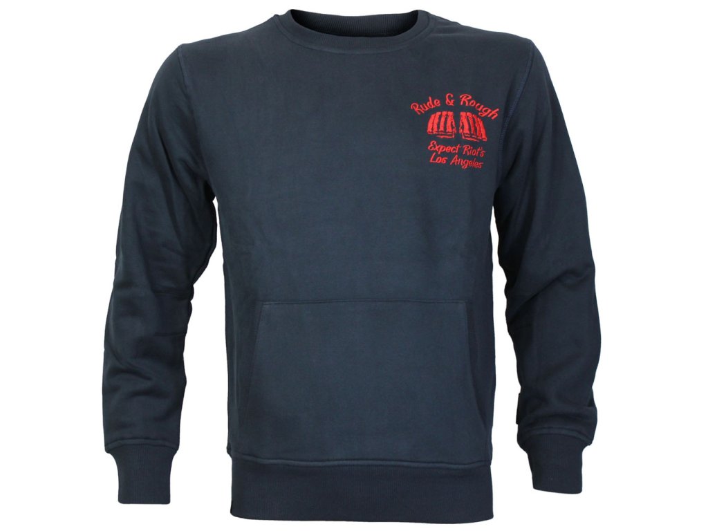 Na přední straně je decentní potisk s motivem nápisu „Rude and Rough“ a malou grafikou, která podtrhuje charakter značky. Mikina má klasický střih s kulatým výstřihem a praktickou klokankovou kapsou pro uvolněný a pohodlný vzhled.