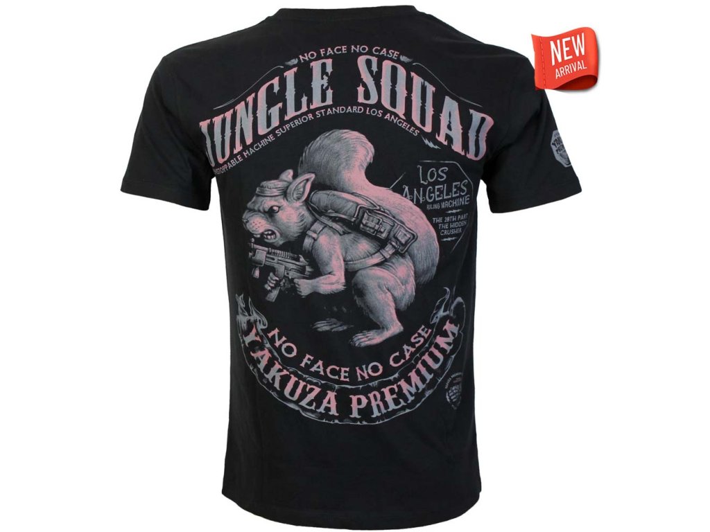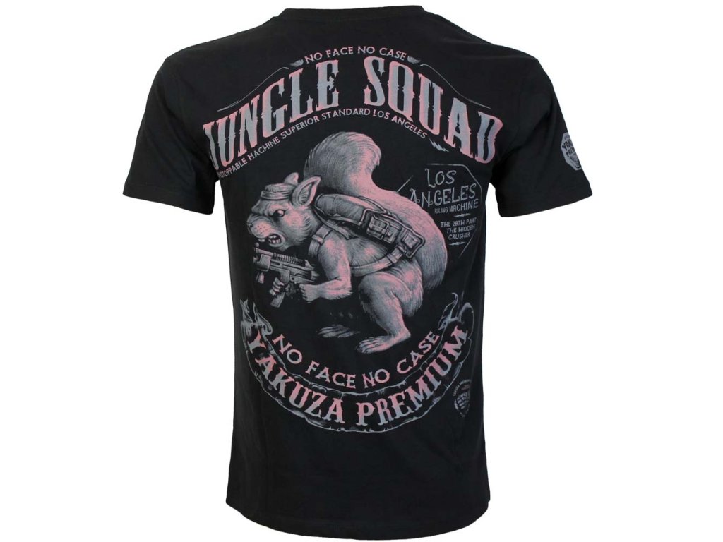 Pánské černé tričko Yakuza Premium YPS 4011 s výrazným zadním potiskem ozbrojené veverky Jungle Squad. Vyrobené z prémiové Pima bavlny, regular fit střih a typický rebelský styl značky.