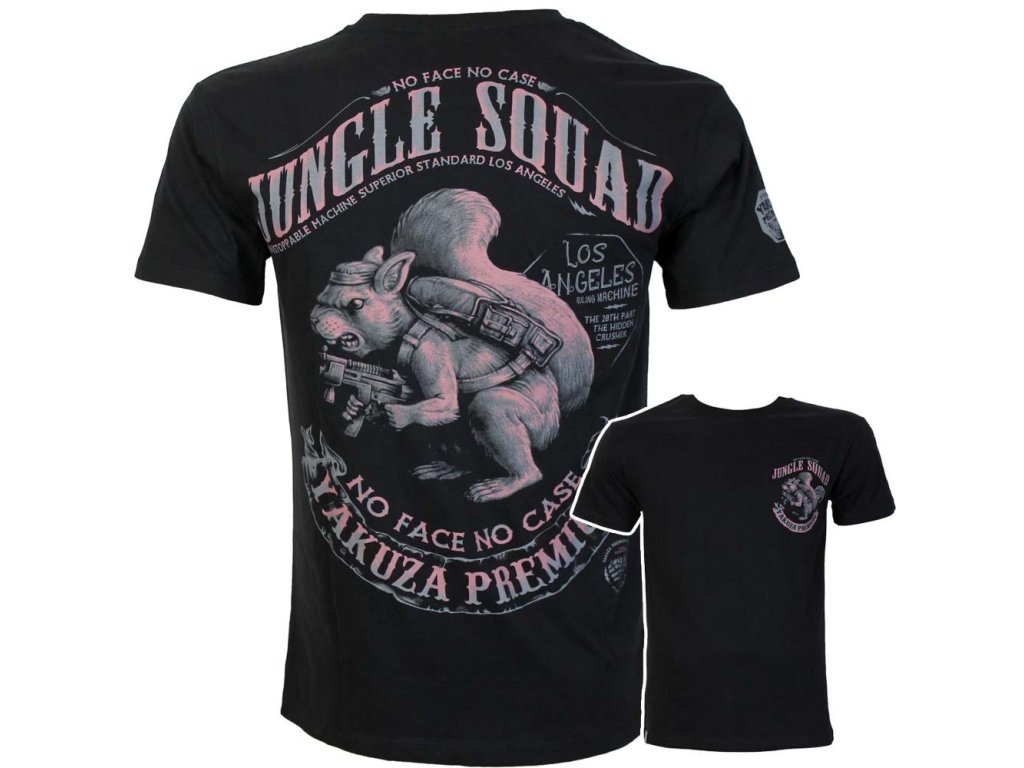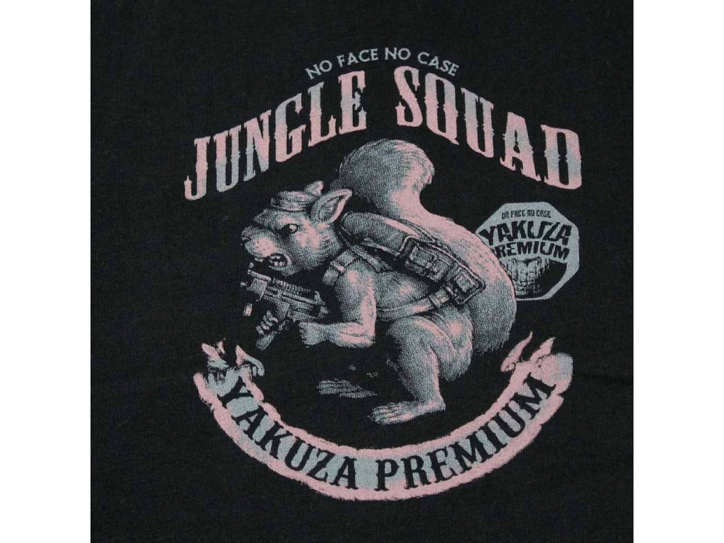 Na levé straně hrudi se nachází menší potisk s logem Jungle Squad, zatímco zadní strana je hlavním vizuálním prvkem tohoto modelu. Dominantou je velká grafika ozbrojené veverky s taktickým vybavením a zbraní, doplněná výraznými slogany a charakteristickou estetikou Yakuza Premium.