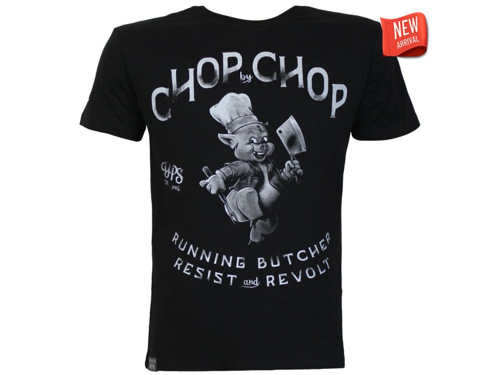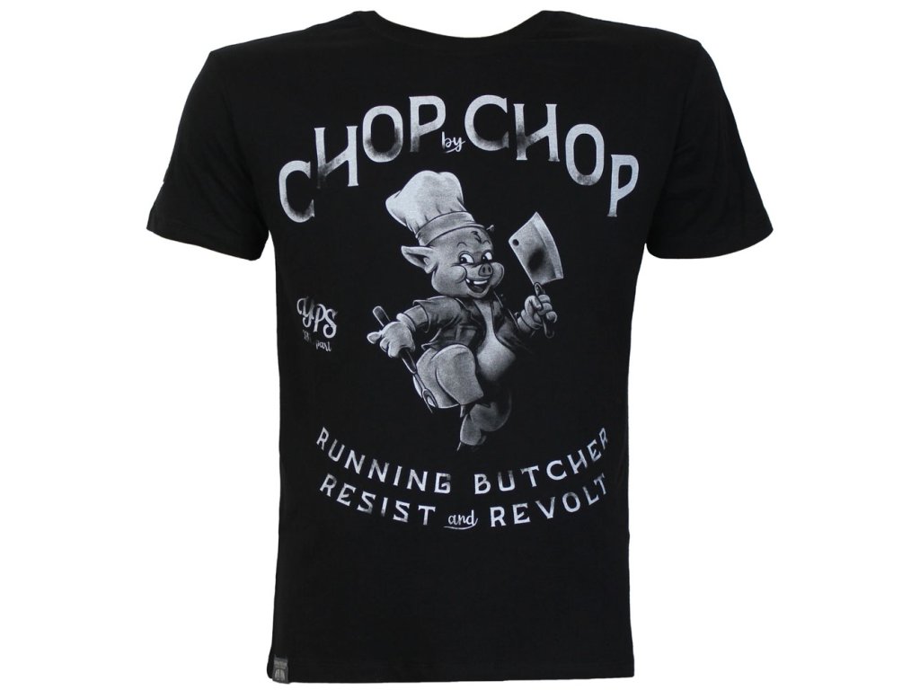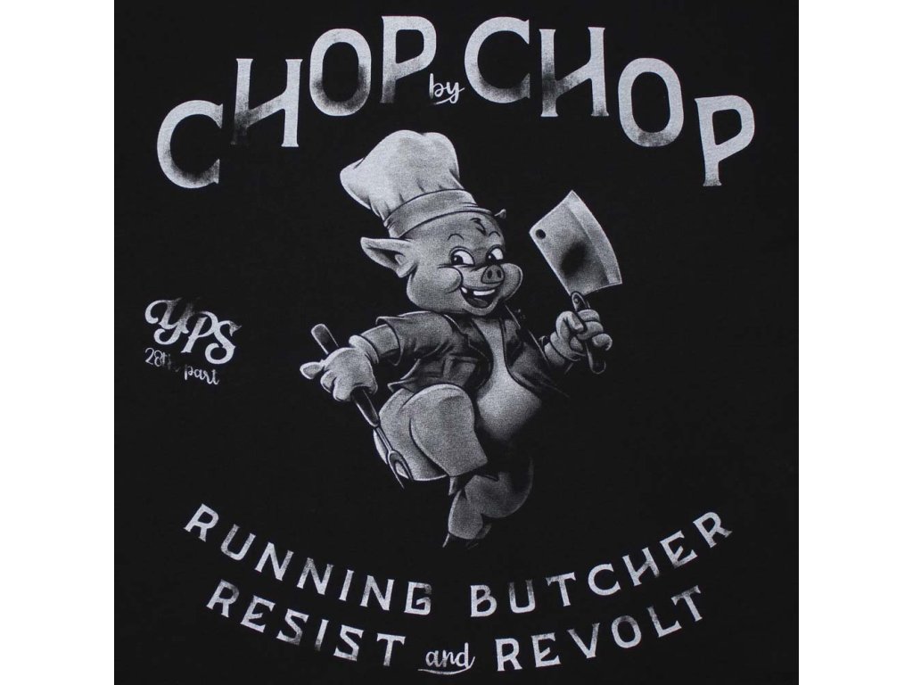 Na přední straně dominuje velký grafický motiv – prasátko v roli kuchaře, které v jedné ruce drží sekáček a v druhé kuchyňské náčiní. Nad motivem je výrazný nápis Chop by Chop, doplněný spodními slogany Running Butcher a Resist and Revolt, které podtrhují typický rebelní humor a drsnější komiksový styl značky.