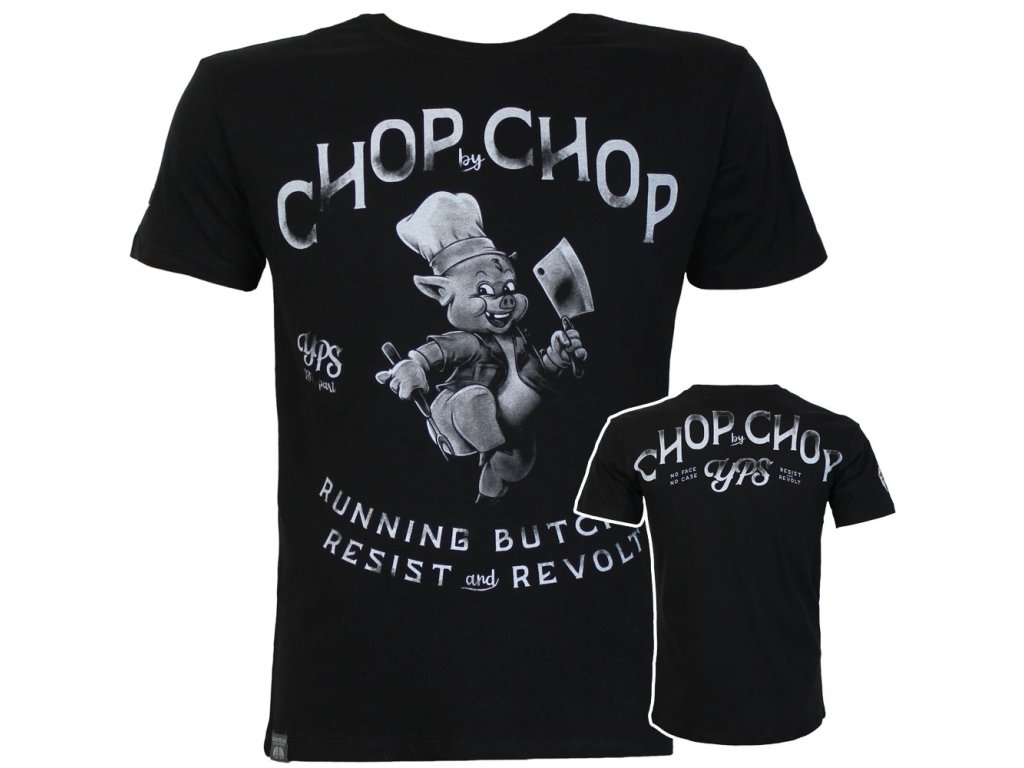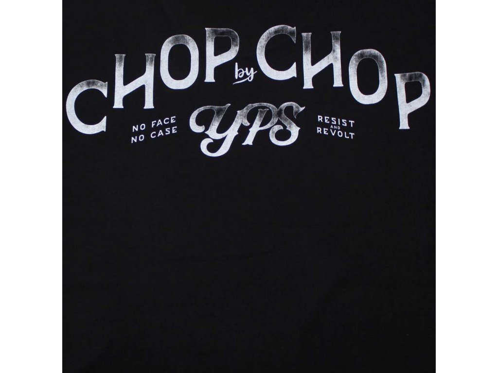 Zadní strana trička nese přes celou šíři ramen velký nápis Chop by Chop, doplněný značkovými motivy YPS, No Face No Case a Resist & Revolt.