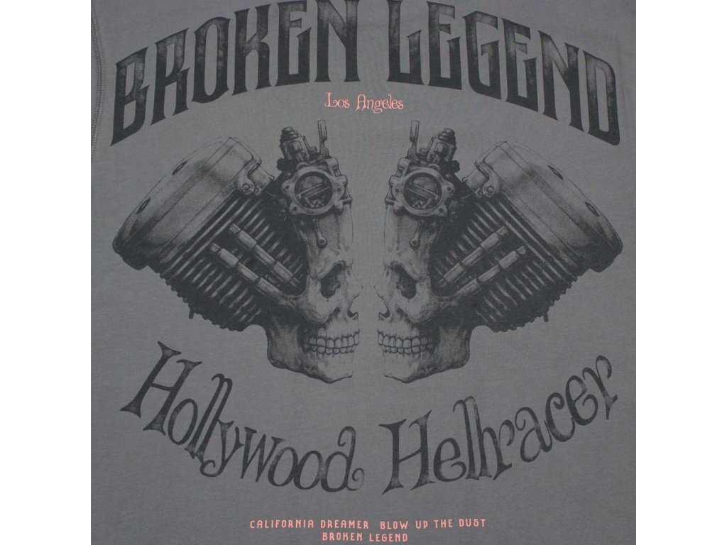Na přední straně se nachází menší motiv se sloganem Broken Legend a ikonickým dvoumotorovým designem. Zadní část trička však přináší hlavní grafický motiv – masivní potisk BROKEN LEGEND v horní části a výrazný nápis Hollywood Hellracer ve spodním oblouku.