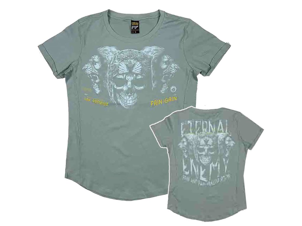 Limitovaná edice z kolekce Part 27 – podzim/zima 2025. Dámské tmavě modré triko s krátkým rukávem a výrazným potiskem přes celou přední část. Hlavní motiv tvoří lebka obklopená dvěma tvářemi panterů, doplněná o slogany Yakuza Premium, Pain and Gain a na zádech výrazný nápis Eternal Enemy. Vyrobeno z kvalitní 100% bavlny pro pohodlí a dlouhou životnost. Střih je lehce projmutý, se zaobleným a prodlouženým zadním lemem pro moderní vzhled.