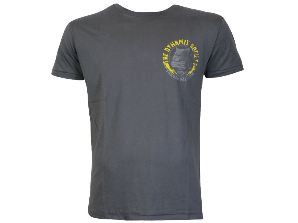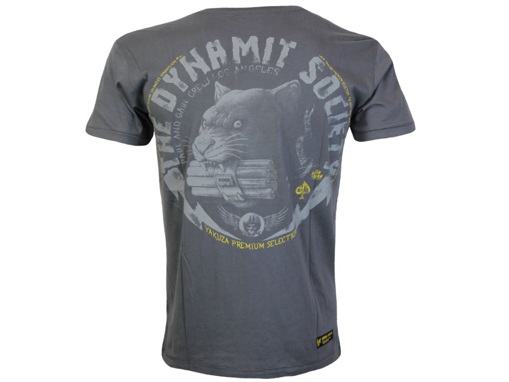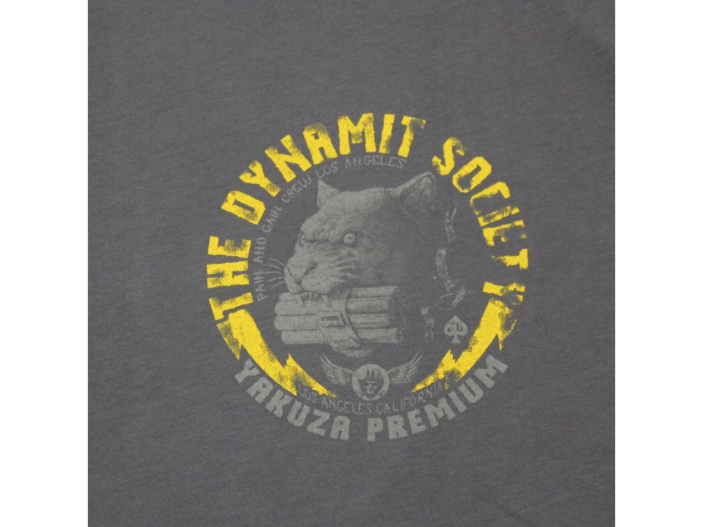 Na tričku je logo s nápisem „The Dynamit Society“ a je doplněno obrázkem hlavy pantera, která má v tlamě dynamit. Design je umístěn na šedém podkladu. Text a obrázek jsou stylizovány tak, aby vypadaly jako logo nějaké drsné motorkářské nebo bojové skupiny. Pod hlavním nápisem jsou menší texty, které doplňují design. Celkově má tričko odvážný, rebelantský vzhled, vhodný pro někoho, kdo chce vyjádřit svou drsnou stránku. Je to součást „Yakuza Premium Selection“