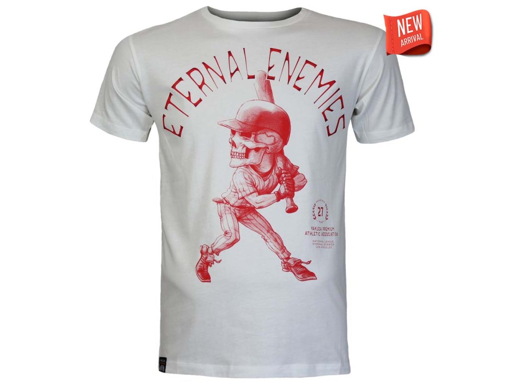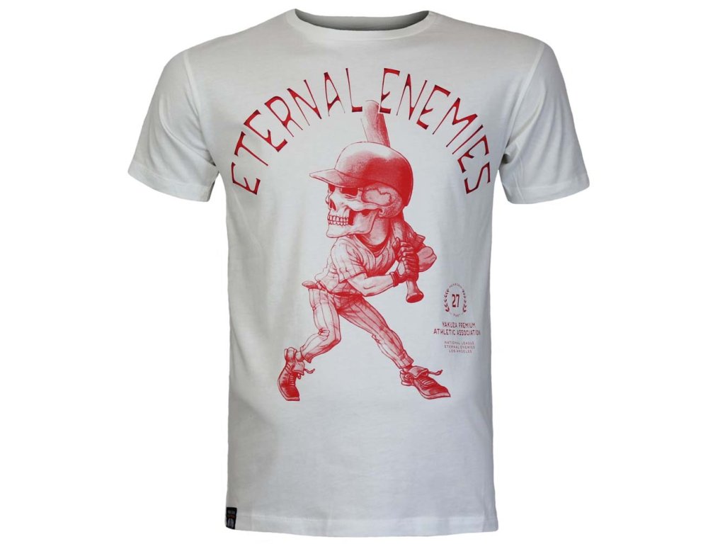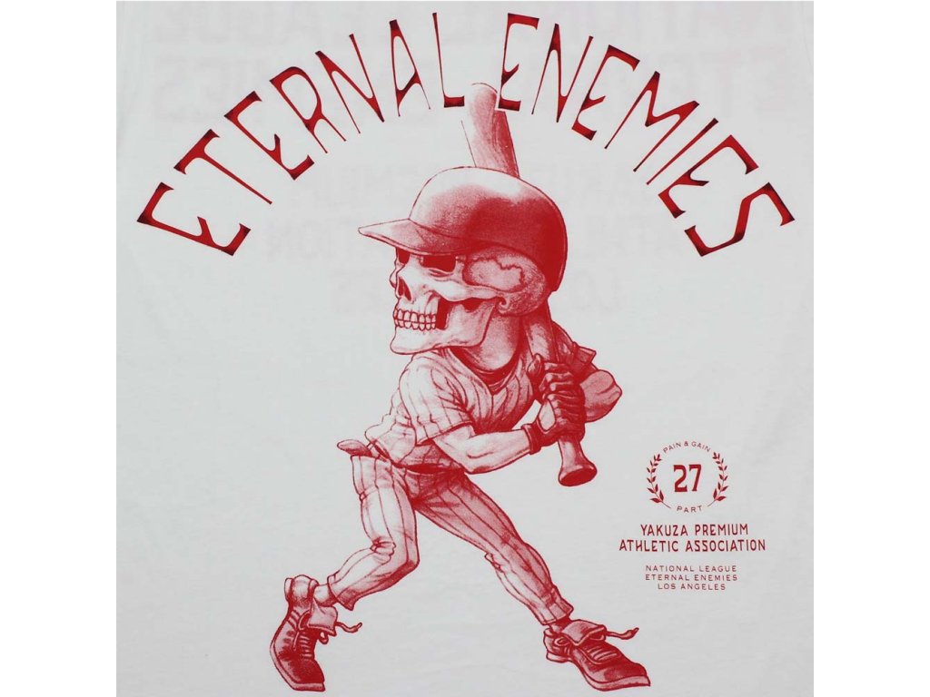 Tričko Yakuza Premium Eternal Enemies přináší neotřelou kombinaci sportovní estetiky a temného rebelství. Hlavní motiv na hrudi – skelet v baseballové výstroji připravený k odpalu – doplňuje nápis ETERNAL ENEMIES (Věční nepřátelé), který odkazuje na nekonečný souboj, soupeření a odmítání smíru. Zadní stranu zdobí nápis NATIONAL LEAGUE – ETERNAL ENEMIES s odkazem na „Athl. Association Los Angeles“, čímž tričko získává atmosféru temného undergroundového týmu.