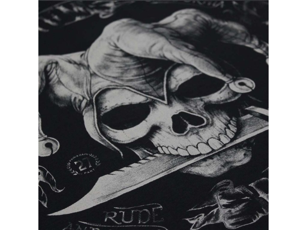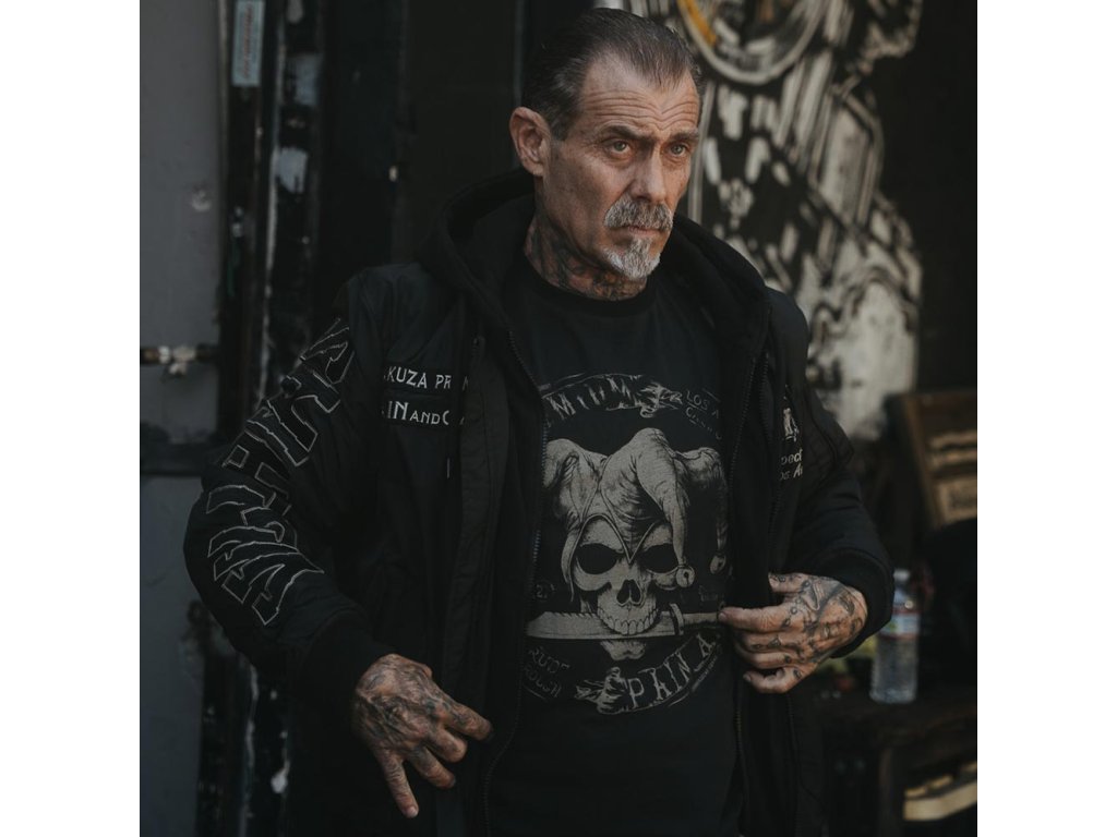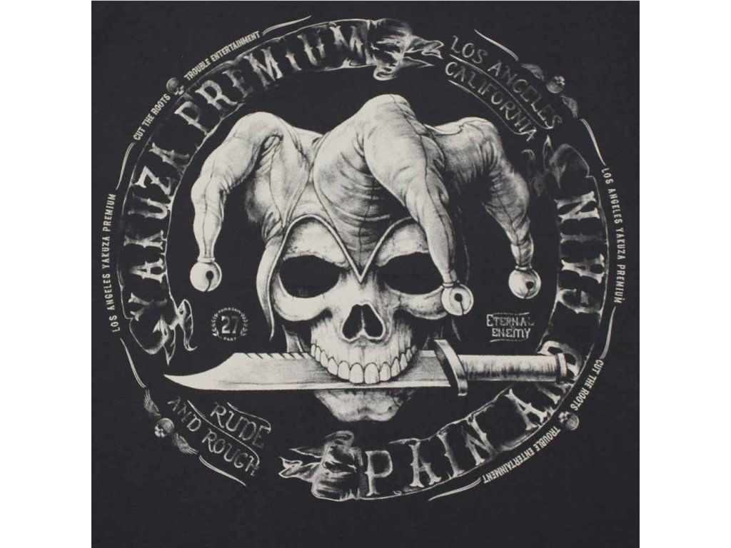 Tričko Yakuza Premium Cut the Roots – Pain and Gain dává jasný signál. Dominantní potisk na hrudi ukazuje lebku v šaškovské čepici s dýkou v ústech, zasazenou do kruhového rámu se silným nápisem Yakuza Premium Pain and Gain. Působivý motiv doplňuje detailní potisk na zádech – Cut the Roots / Pain and Gain. Stylová značka Pain & Gain s mřížemi je všitá na spodním lemu a nechybí ani decentní potisk na rukávu.
