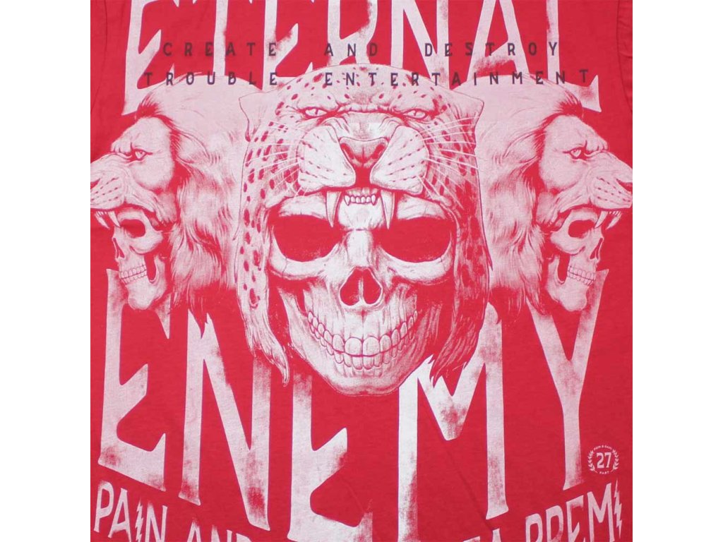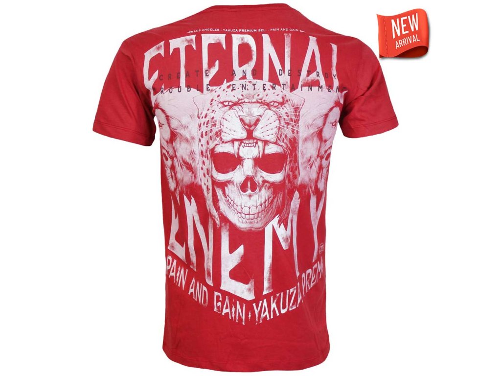 Pánské tričko Yakuza Premium YPS 3903 v červené barvě. Regular fit střih, 100% bavlna, velký potisk Eternal Enemy se šelmou a lebkou na zádech, menší motiv vpředu.Part 27 - podzim/zima roku 2025