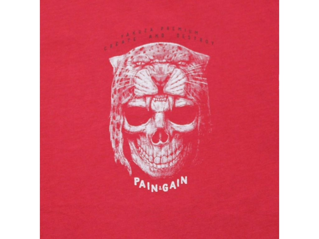 Na přední straně je menší potisk s lebkou/jaguárem a nápisem Pain & Gain, který doplňuje výrazný zadní motiv.