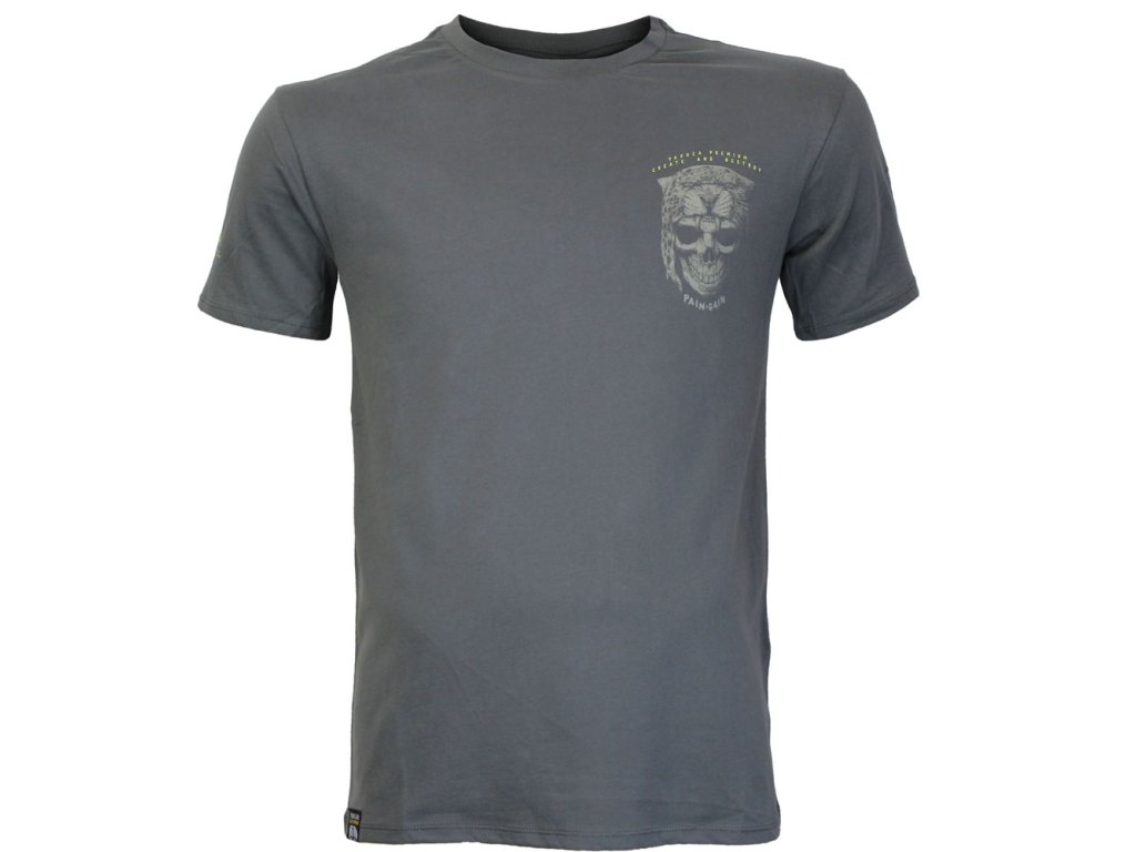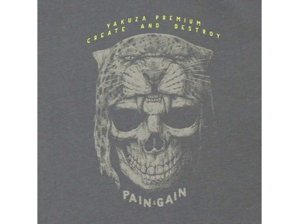 Šedé tričko Yakuza Premium YPS 3903 s motivem Eternal Enemy. Velký potisk lebky s kůží a hlavou lva a dvěma lvy, doplněný nápisy Pain and Gain – Los Angeles. Part 27 - podzim/zima roku 2025