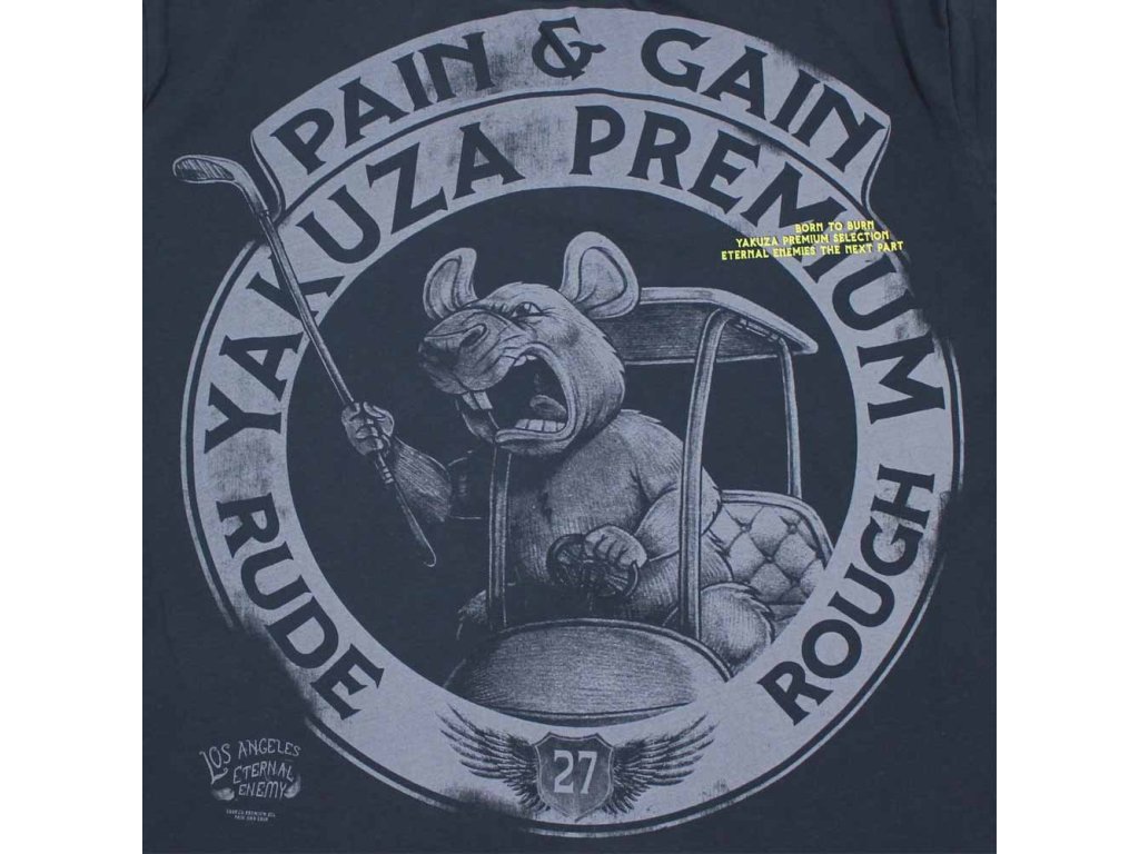 Dominantní potisk na hrudi představuje zuřivého hlodavce s baseballovou pálkou, obklopeného kruhovým nápisem RUDE & ROUGH – Yakuza Premium – Pain & Gain. Symbol síly, drzosti a neústupnosti, který odkazuje na pouliční bojovnost i sportovní rivalitu.