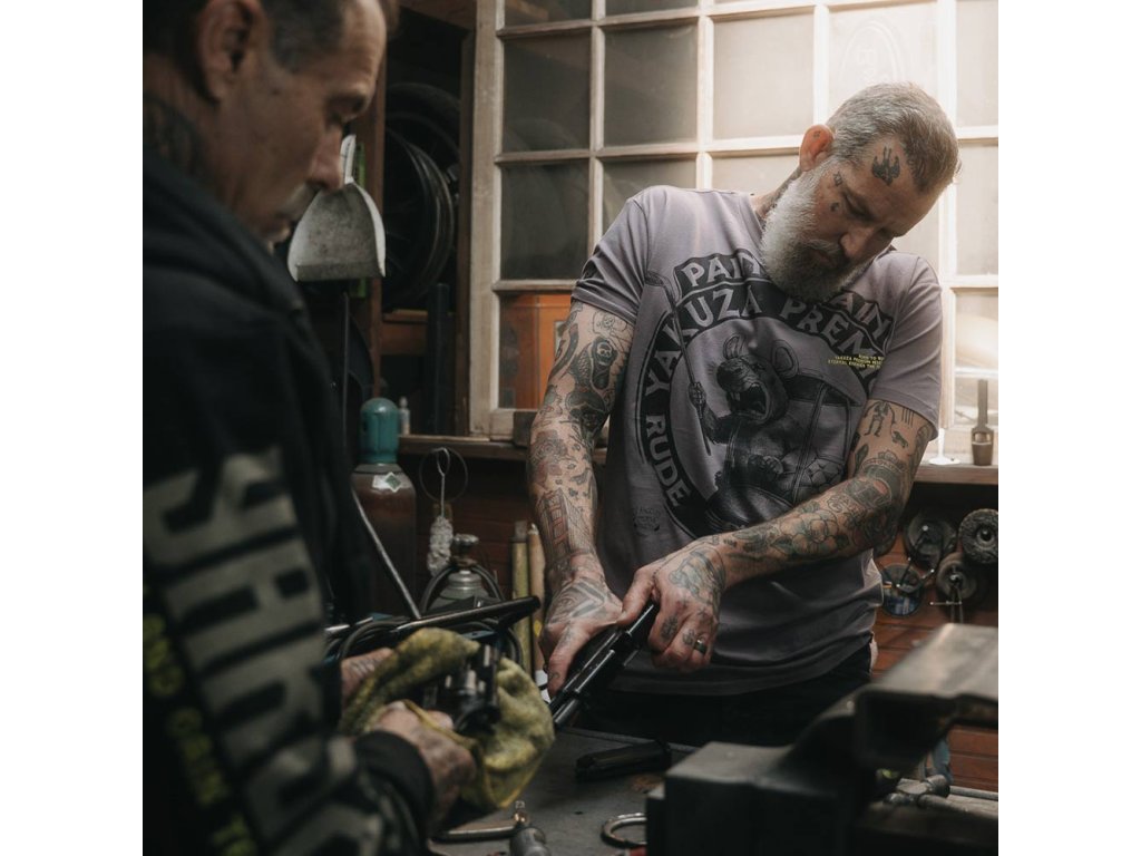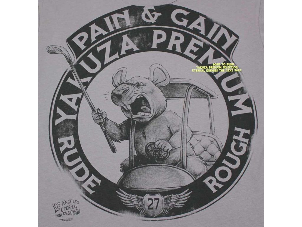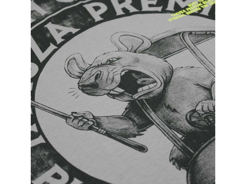 Dominantní potisk na hrudi představuje zuřivého hlodavce s baseballovou pálkou, obklopeného kruhovým nápisem RUDE & ROUGH – Yakuza Premium – Pain & Gain. Symbol síly, drzosti a neústupnosti, který odkazuje na pouliční bojovnost i sportovní rivalitu.