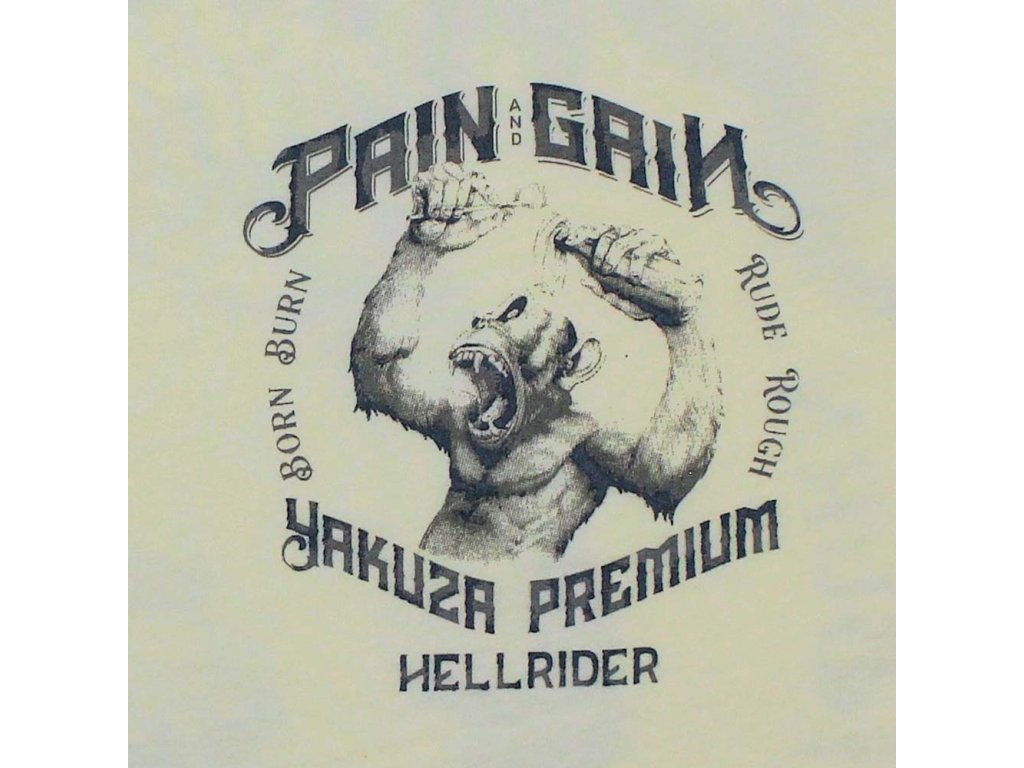 Dominantní potisk na zádech zobrazuje rozzlobenou opici držící Molotovův koktejl a zapálenou sirku, obklopenou nápisy Pain and Gain – Yakuza Premium – Hellrider a slogany Born to Burn a Rude & Rough. Design zosobňuje vzdor, rebelii a nespoutanou touhu po svobodě, typickou pro značku Yakuza Premium.