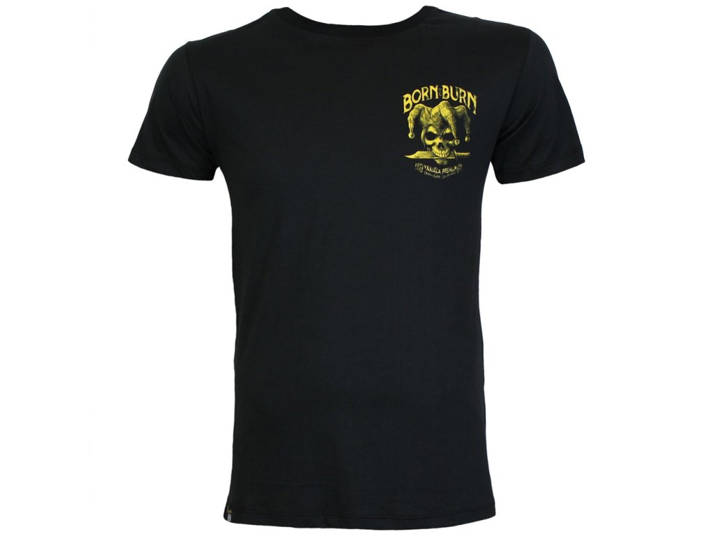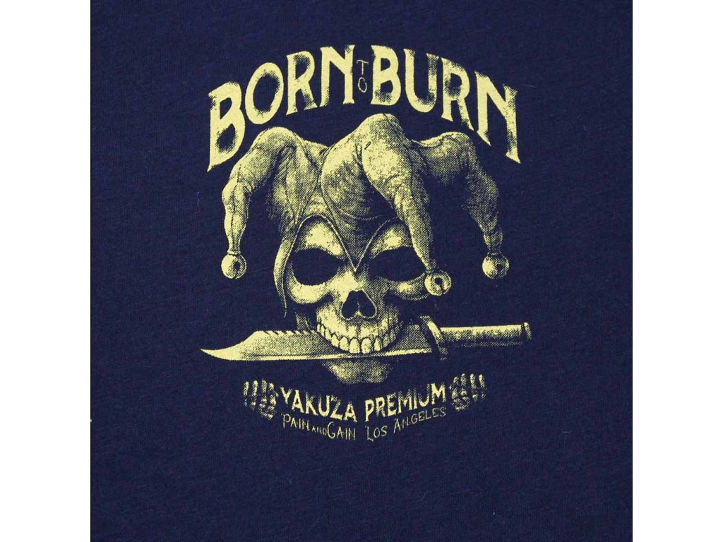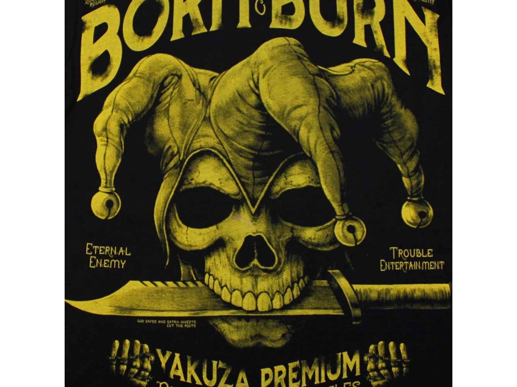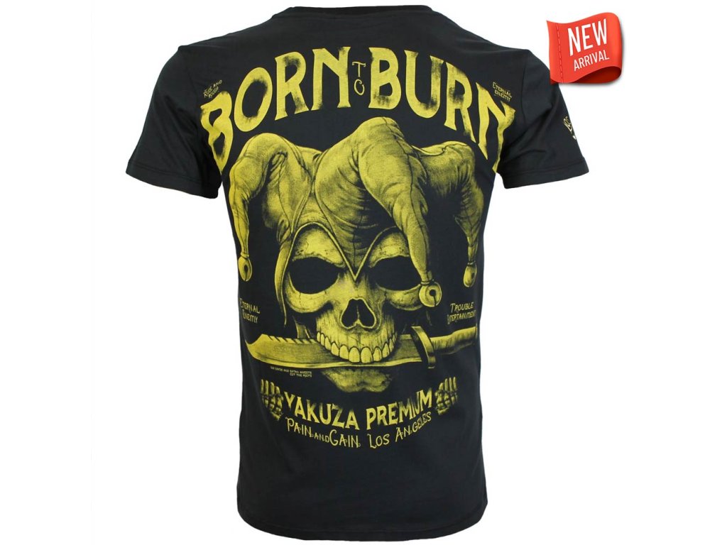 Pánské tričko Yakuza Premium YPS 3910 v černé barvě. Regular fit střih, 100% bavlna, potisk Born to Burn s lebkou šaška a nožem na zádech i menší motiv vpředu. Part 27 - podzim/zima roku 2025