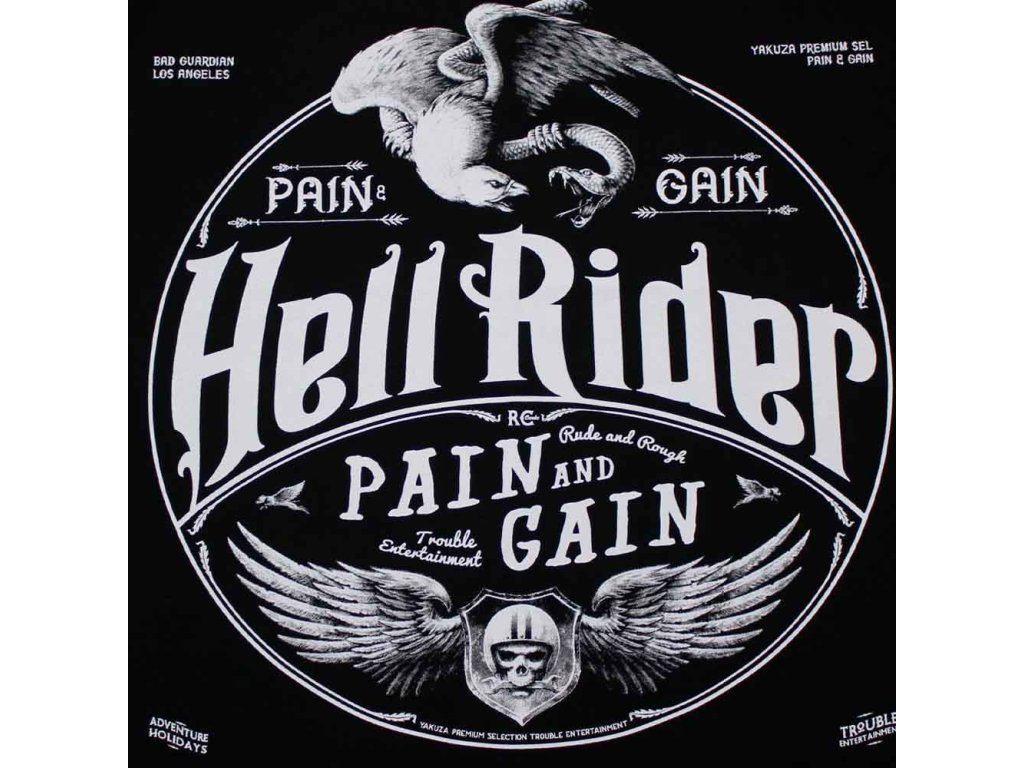 Na hrudi dominuje kruhový potisk s motivem Hell Rider – lebka jezdce a křídla s lebkou pod heslem PAIN AND GAIN. Celkový design odkazuje na temnou jízdu životem, sílu a nespoutanou energii.