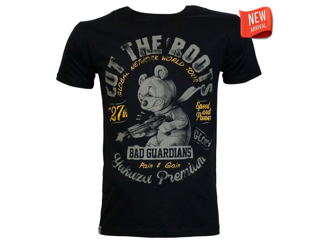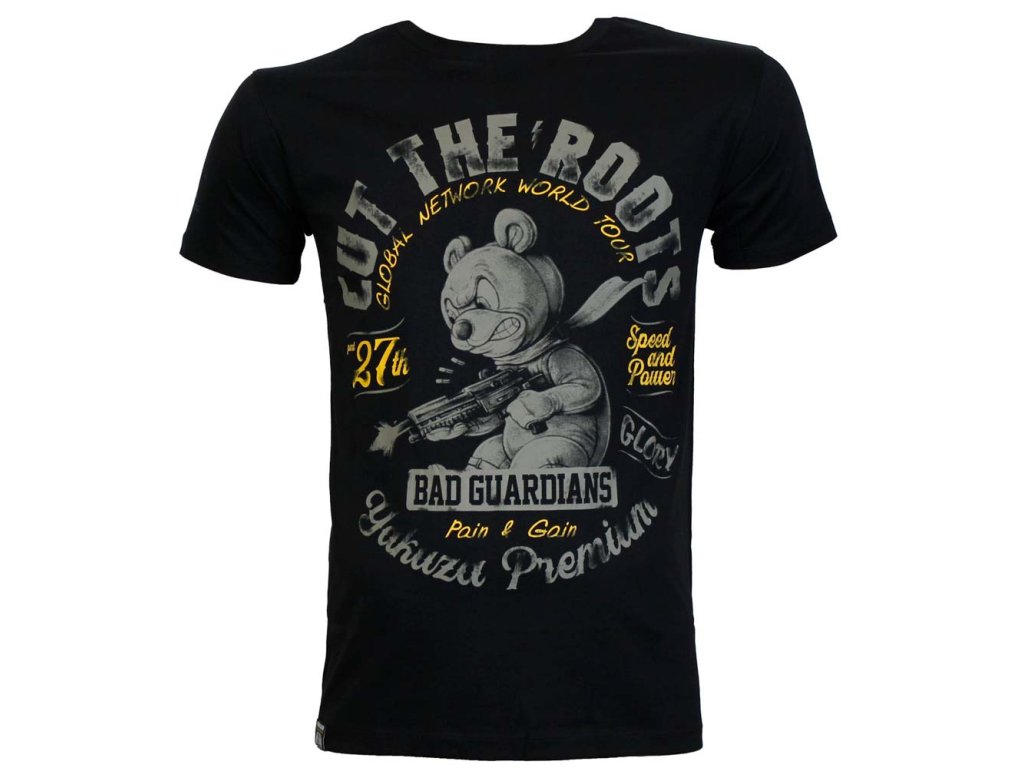 Pánské tričko Yakuza Premium YPS 3914 v černé barvě. Regular fit střih, 100% bavlna, výrazný potisk Bad Guardians s medvídkem a kulometem na přední straně. Part 27 - podzim/zima roku 2025