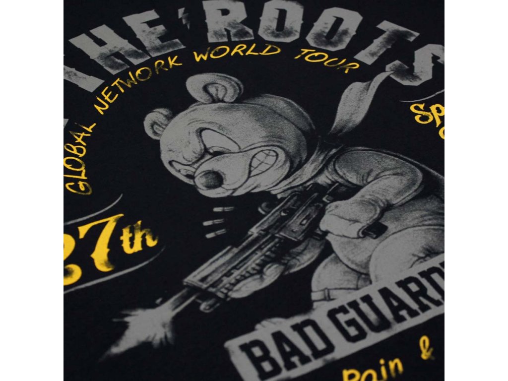 Na přední straně dominuje výrazný potisk s motivem rozzlobeného medvídka s kulometem, doplněný nápisy Cut the Roots – Bad Guardians – Speed and Power – Glory. Design působí provokativně a symbolizuje vzdor, odhodlání a sílu.