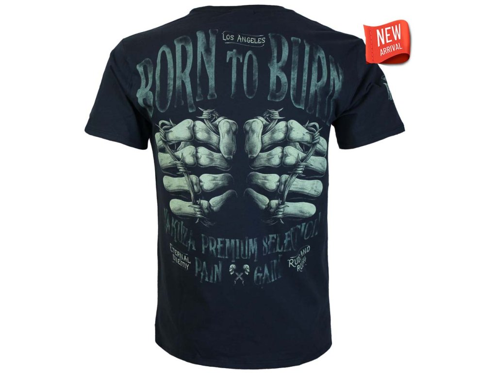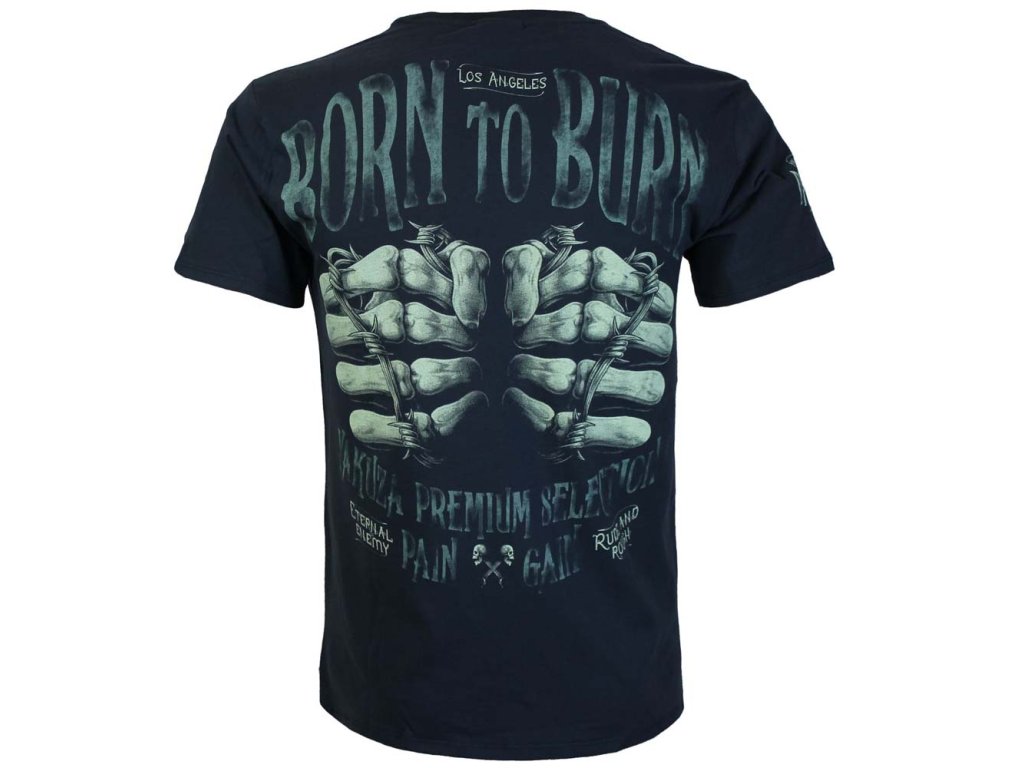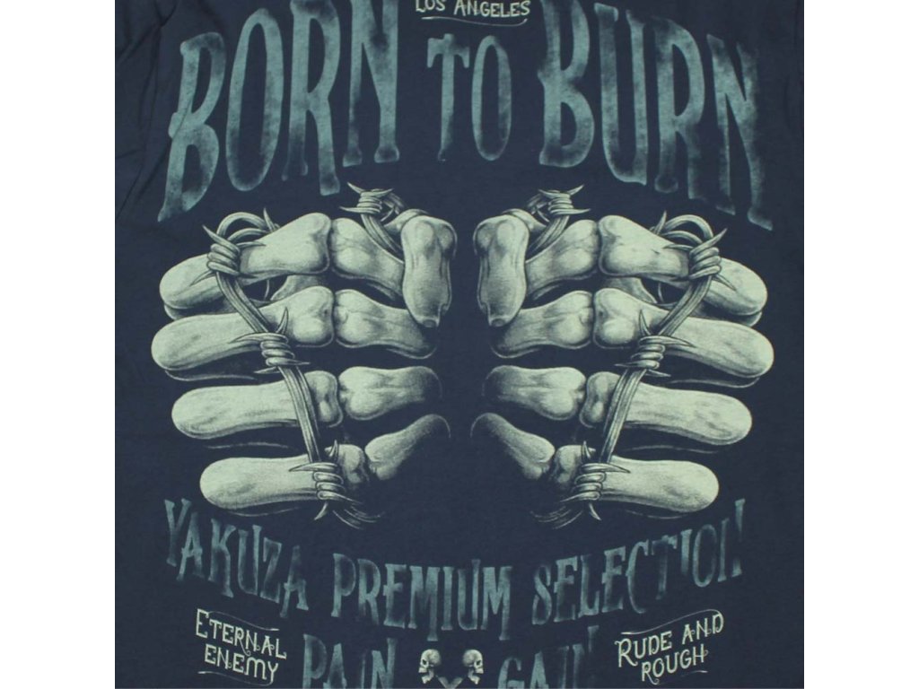Na zádech dominuje masivní potisk s nápisem BORN TO BURN, pod kterým jsou vyobrazeny kostnaté ruce omotané ostnatým drátem. Celý motiv doplňuje logo Yakuza Premium Selection – Pain & Gain a nápisy Eternal Enemy, Rude & Rough, které podtrhují rebelský a syrový charakter trička.