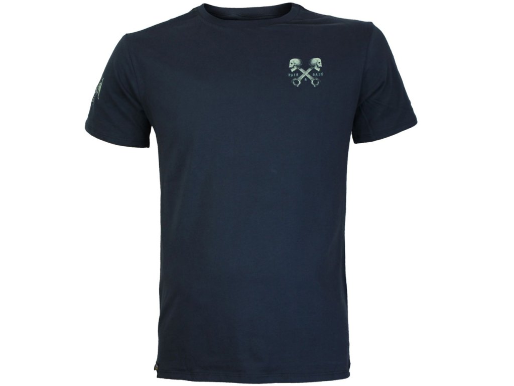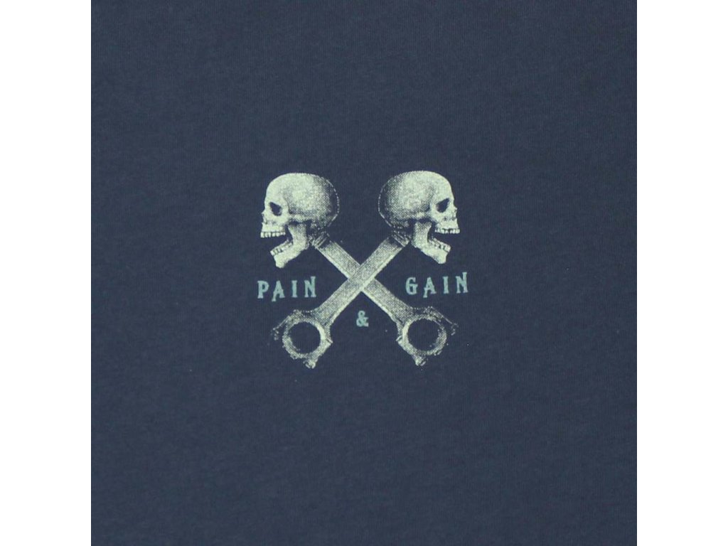 Na hrudi je menší motiv s lebkou a zkříženými lebkami, nechybí ani potisk na rukávu a label Pain & Gain.