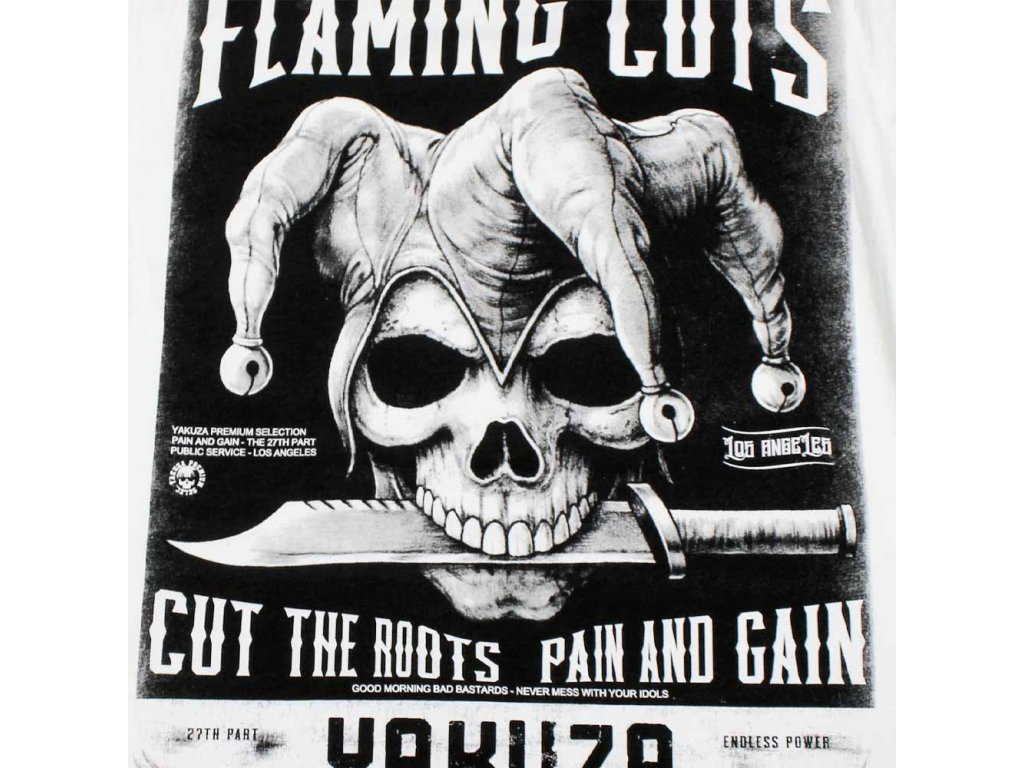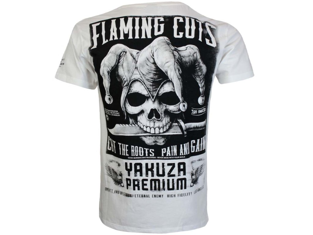 Pánské tričko Yakuza Premium Selection YPS 3916 bílé, Flaming Cuts - Los Angeles - Pain and Gain - Cut the roots, Part 27 - podzim/zima roku 2025