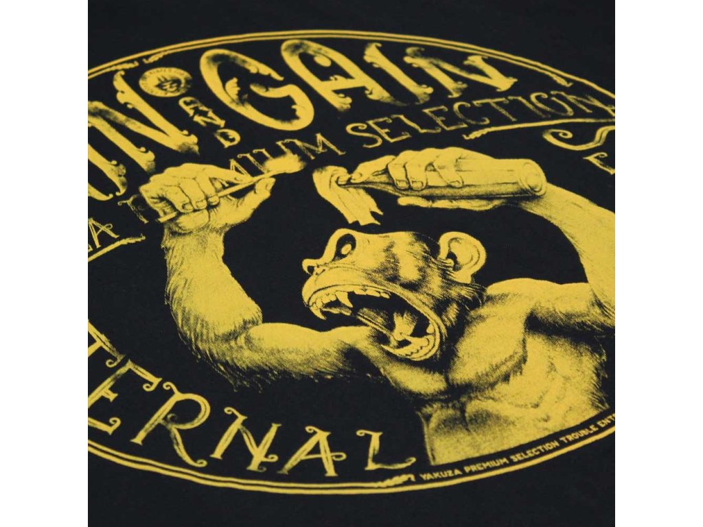 Černé tričko Yakuza Premium YPS 3918 s motivem Pain and Gain – Eternal Enemies. Dominantní potisk rozzuřeného tvora s Molotovem a zapálenou sirkou vyjadřuje rebelii a sílu. Part 27 - podzim/zima roku 2025